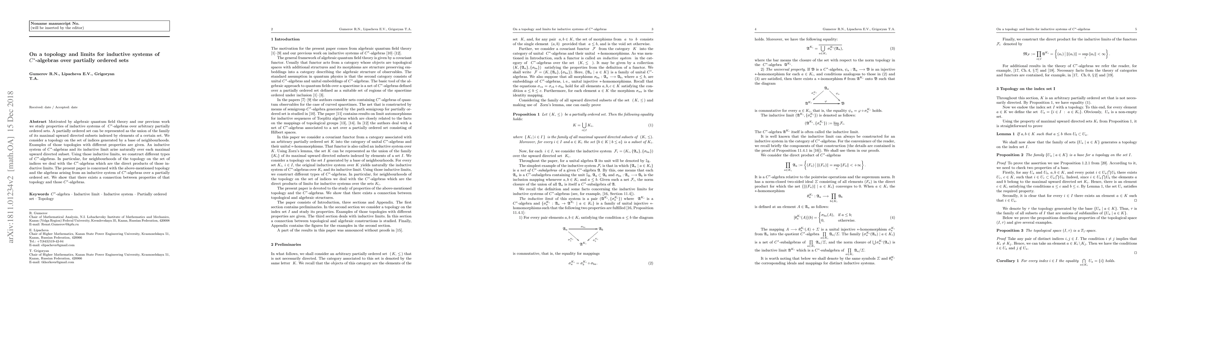 Motivated by algebraic quantum field theory and our previous work we study properties of inductive systems of \ $C^*$-algebras over arbitrary partially ordered sets. A partially ordered set can be represented as the union of the family of its maximal upward directed subsets indexed by elements of a certain set. We consider a topology on the set of indices generated by a base of neighbourhoods. Examples of those topologies with different properties are given. An inductive system of $C^*$-algebras and its inductive limit arise naturally over each maximal upward directed subset. Using those inductive limits, we construct different types of $C^*$-algebras. In particular, for neighbourhoods of the topology on the set of indices we deal with the $C^*$-algebras which are the direct products of those inductive limits. The present paper is concerned with the above-mentioned topology and the algebras arising from an inductive system of $C^*$-algebras over a partially ordered set. We show that there exists a connection between properties of that topology and those $C^*$-algebras.