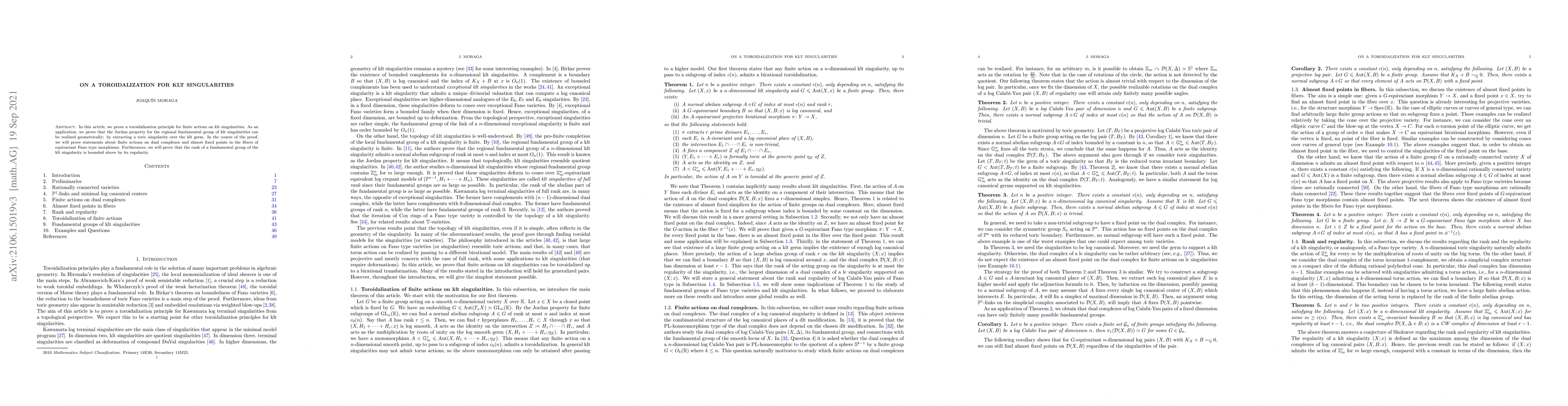 In this article, we prove a toroidalization principle for finite actions on klt singularities. As an application, we prove that the Jordan property for the regional fundamental group of klt singularities can be realized geometrically: by extracting a toric singularity over the klt germ. In the course of the proof, we will prove statements about finite actions on dual complexes and almost fixed points in the fibers of equivariant Fano type morphisms. Furthermore, we will prove that the rank of a fundamental group of the klt singularity is bounded above by its regularity.