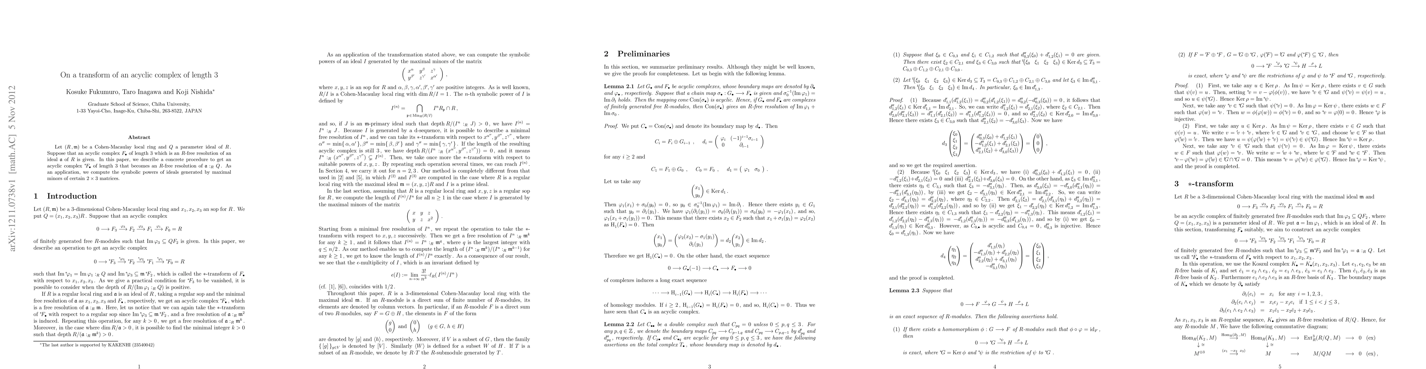 Let (R, m) be a Cohen-Macaulay local ring and Q a parameter ideal of R. Suppose that an acyclic complex of length 3 which is an R-free resolution of an ideal I of R is given. In this paper, we describe a concrete procedure to get an acyclic complex of length 3 that becomes an R-free resolution of I : Q. As an application, we compute the symbolic powers of ideals generated by maximal minors of certain 2 x 3 matrices.