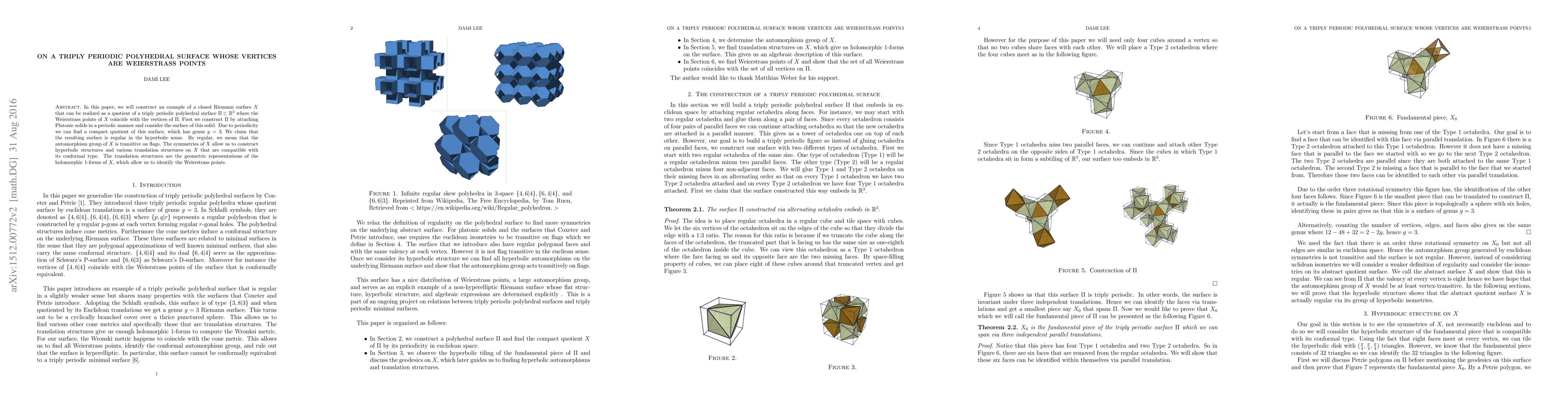 In this paper, we will construct an example of a closed Riemann surface $X$ that can be realized as a quotient of a triply periodic polyhedral surface $\Pi \subset \mathbb{R}^3$ where the Weierstrass points of $X$ coincide with the vertices of $\Pi.$ First we construct $\Pi$ by attaching Platonic solids in a periodic manner and consider the surface of this solid. Due to periodicity we can find a compact quotient of this surface, which has genus $g = 3.$ We claim that the resulting surface is not hyperelliptic and also that it is regular. By regular, we mean that the automorphism group of $X$ is transitive on flags. The symmetries of $X$ allow us to construct hyperbolic structures and various translation structures on $X$ that are compatible with its conformal type. The translation structures are the geometric representations of the holomorphic 1-forms of $X,$ which allow us to identify the Weierstrass points.