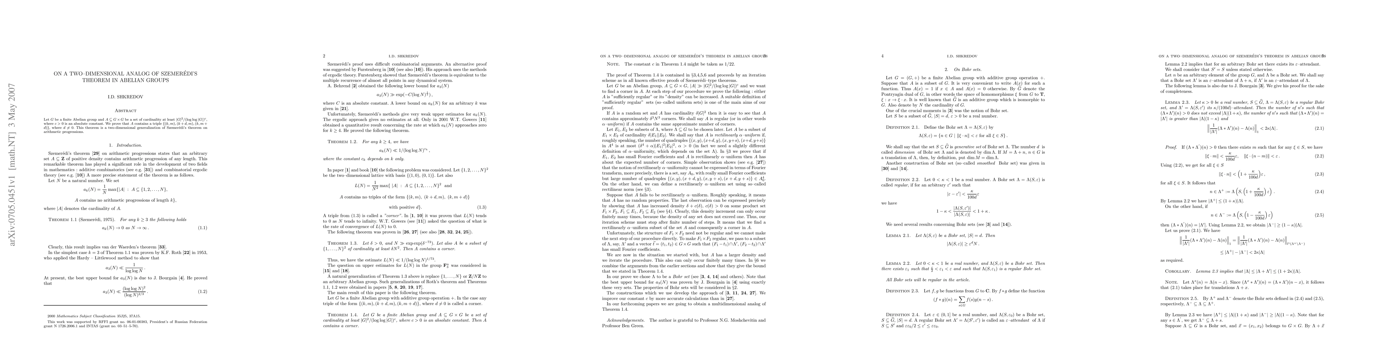 Let G be a finite Abelian group and A be a subset G\times G of cardinality at least |G|^2/(log log |G|)^c, where c>0 is an absolute constant. We prove that A contains a triple {(k,m), (k+d,m), (k,m+d)}, where d does not equal 0. This theorem is a two-dimensional generalization of Szemeredi's theorem on arithmetic progressions.