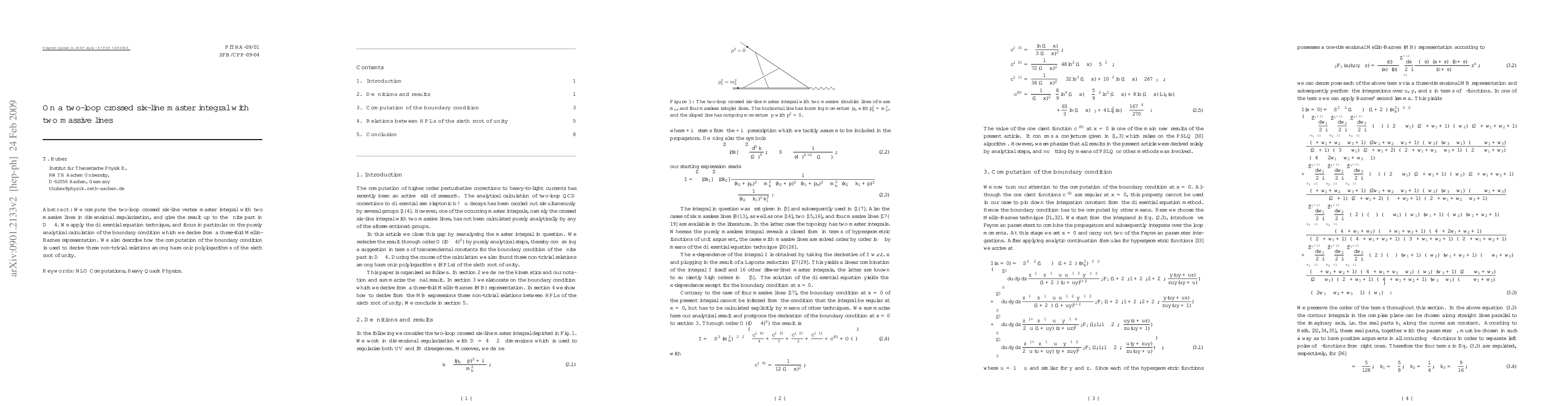 This paper computes the two-loop crossed six-line vertex master integral with two massive lines in dimensional regularisation, focusing on an analytical calculation of the boundary condition via a three-fold Mellin-Barnes representation. It also derives three non-trivial relations among harmonic polylogarithms of the sixth root of unity using the computed boundary condition.