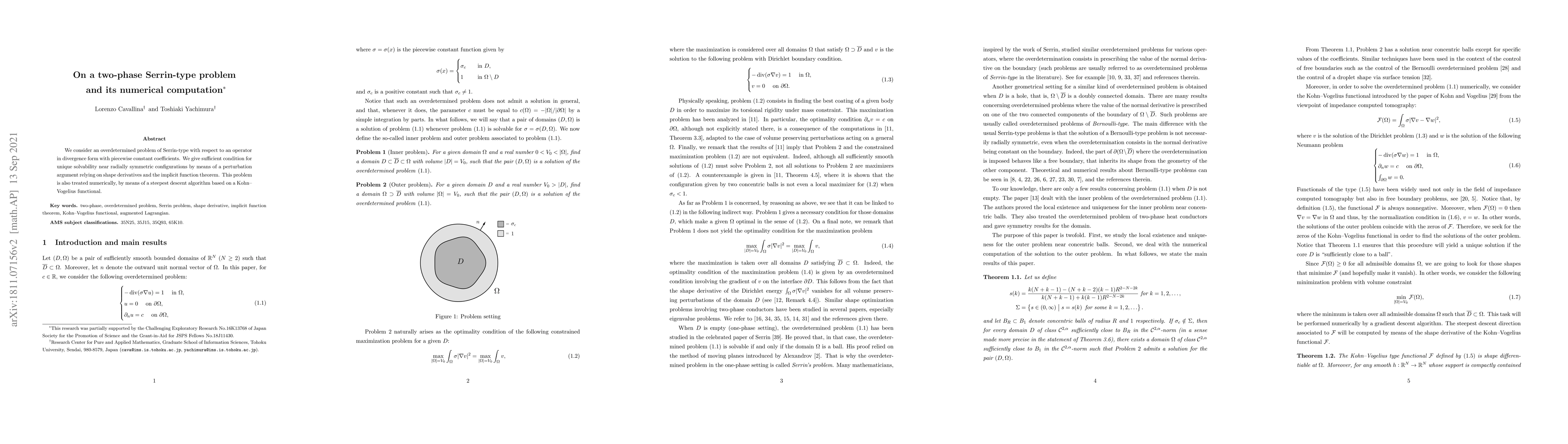 We consider an overdetermined problem of Serrin-type with respect to an operator in divergence form with piecewise constant coefficients. We give sufficient condition for unique solvability near radially symmetric configurations by means of a perturbation argument relying on shape derivatives and the implicit function theorem. This problem is also treated numerically, by means of a steepest descent algorithm based on a Kohn-Vogelius functional.
