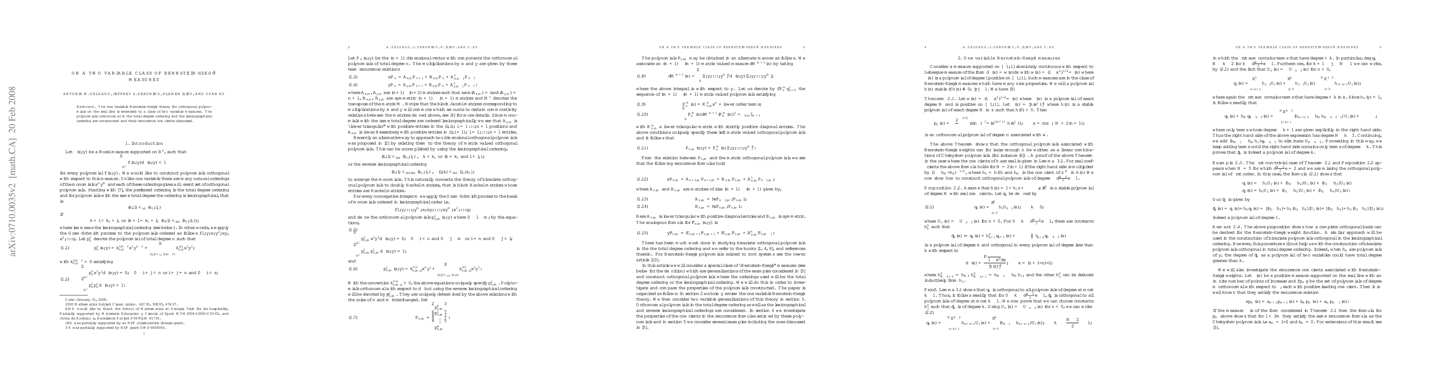 Summary: This paper extends the Bernstein-Szego theory from one to two variables, constructing orthonormal polynomials in both total degree and lexicographical orderings, and analyzes their recurrence coefficients.