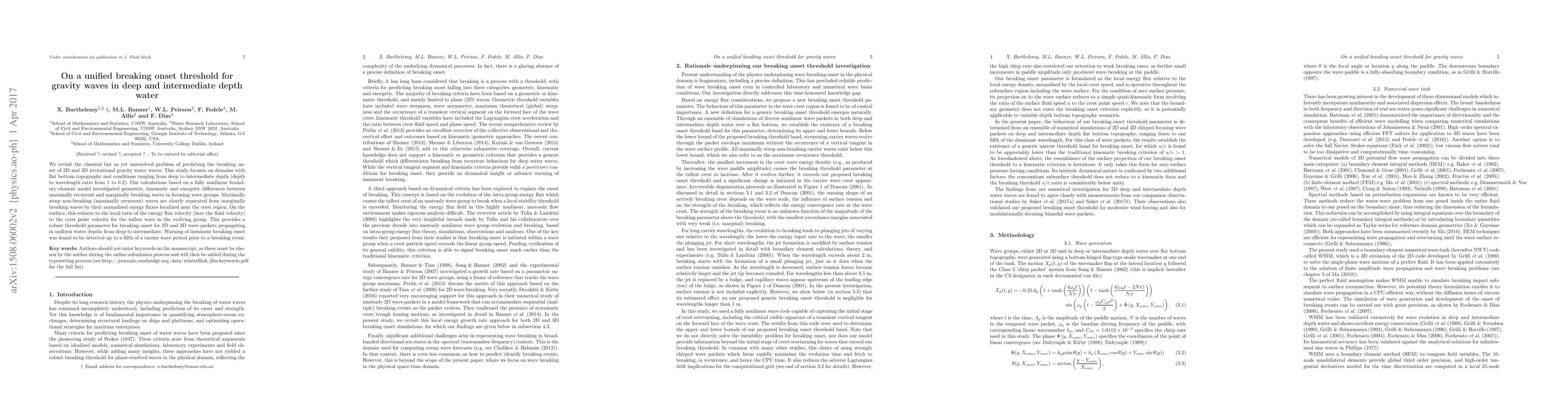 This paper proposes a unified threshold parameter for predicting the onset of breaking in 2D and 3D gravity waves across deep and intermediate water depths. The study identifies a robust criterion based on the ratio of energy flux velocity to crest point velocity, which can detect breaking onset up to a fifth of a wave period in advance.