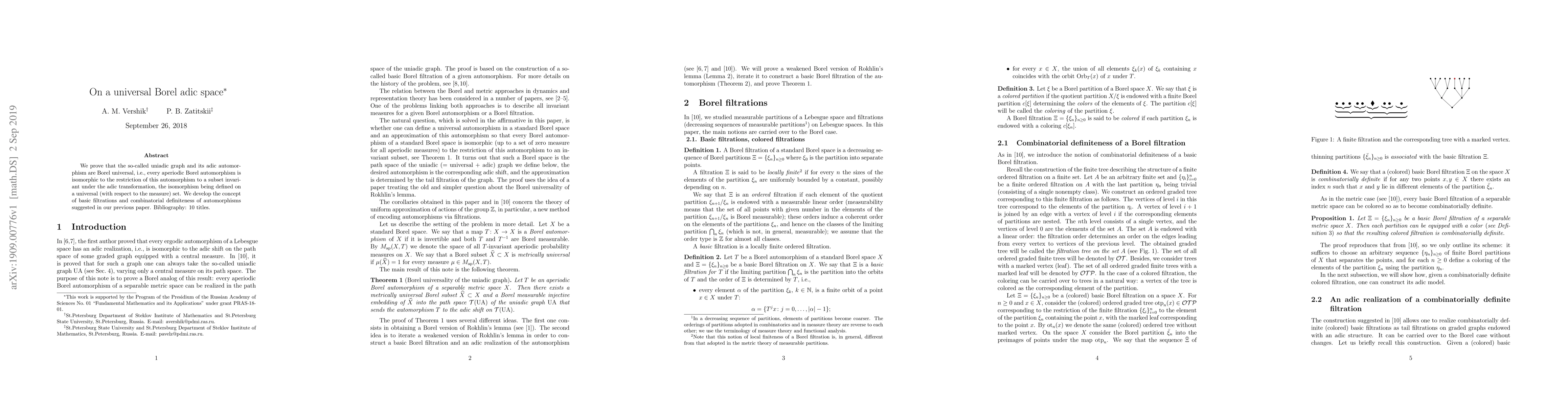 This research proves the universality of the uniadic graph and its adic automorphism in Borel adic spaces, establishing that every aperiodic Borel automorphism corresponds to a restricted form of these, via an isomorphism on a universal set. It also introduces the concepts of basic filtrations and combinatorial definiteness of automorphisms.