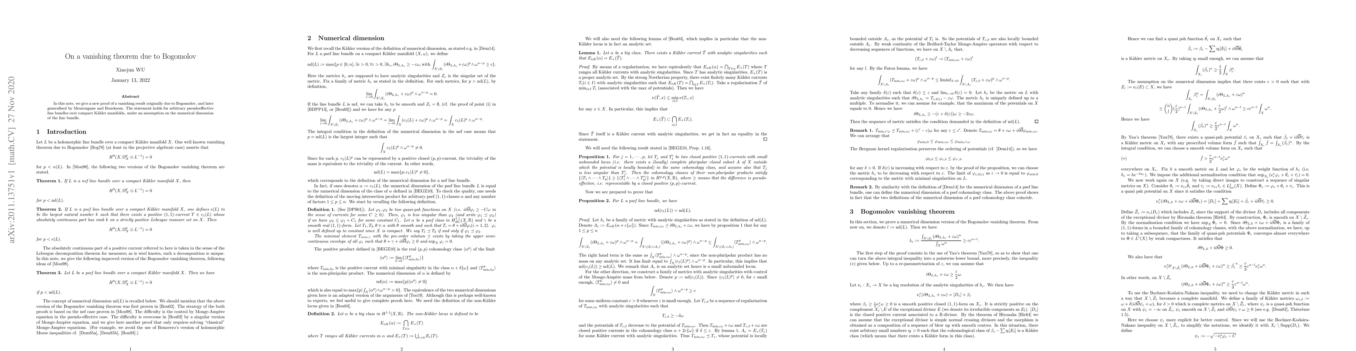 Summary: This paper presents a new proof for a vanishing theorem initially established by Bogomolov, which applies to pseudoeffective line bundles over compact Kähler manifolds, contingent on the numerical dimension of the line bundle. The result was later expanded by Mourougane and Boucksom.