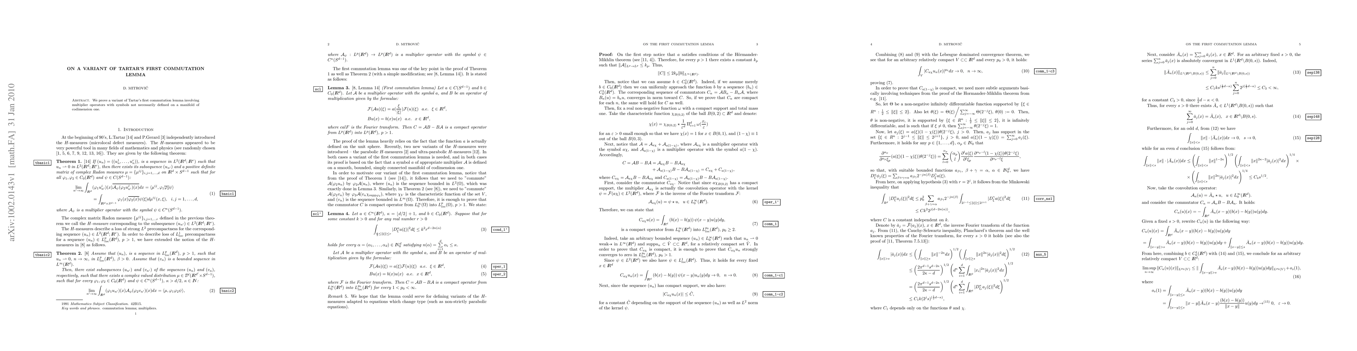 We prove a variant of Tartar's first commutation lemma involving multiplier operators with symbols not necessarily defined on a manifold of codimension one.