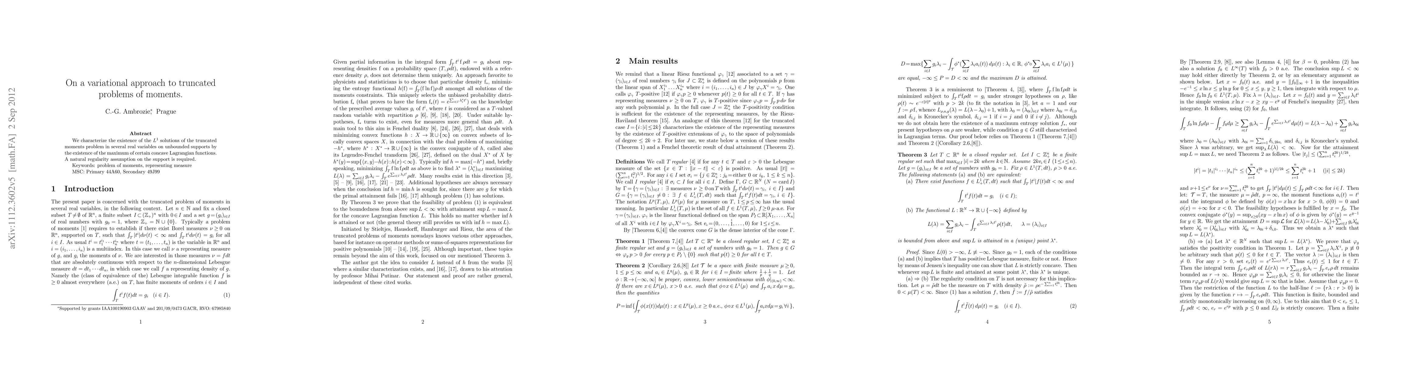 The paper presents a variational approach to solve truncated moment problems in multiple real variables over unbounded domains. It establishes the existence of L^1 solutions by linking it to the maximization of specific concave Lagrangian functions, subject to a natural regularity assumption on the support.