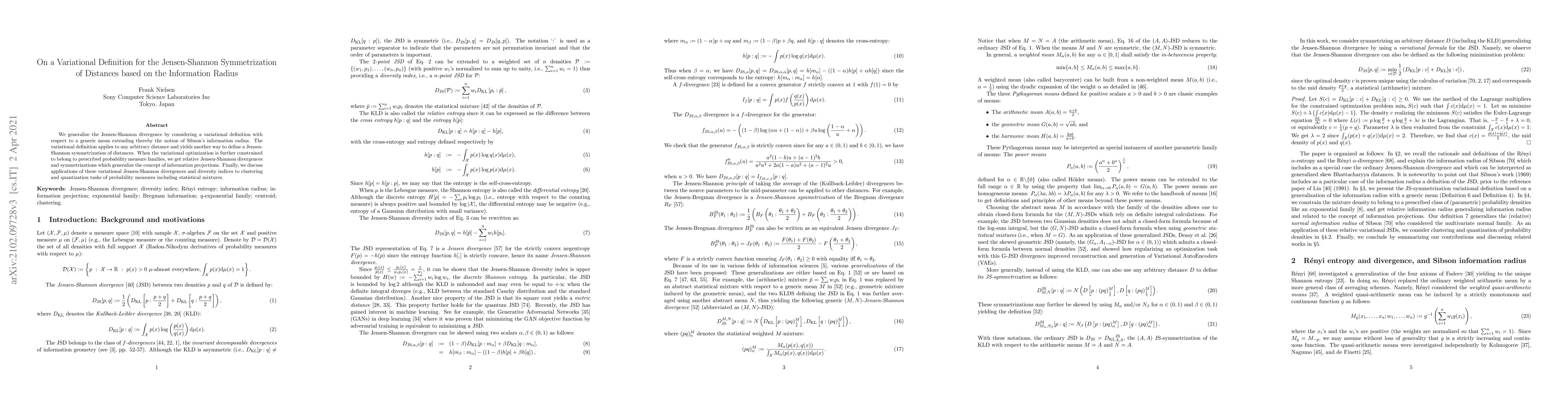 This paper generalizes the Jensen-Shannon divergence using a variational definition based on Sibson's information radius, providing a new method for Jensen-Shannon symmetrization of distances. It also explores applications to clustering and quantization of probability measures, including statistical mixtures.