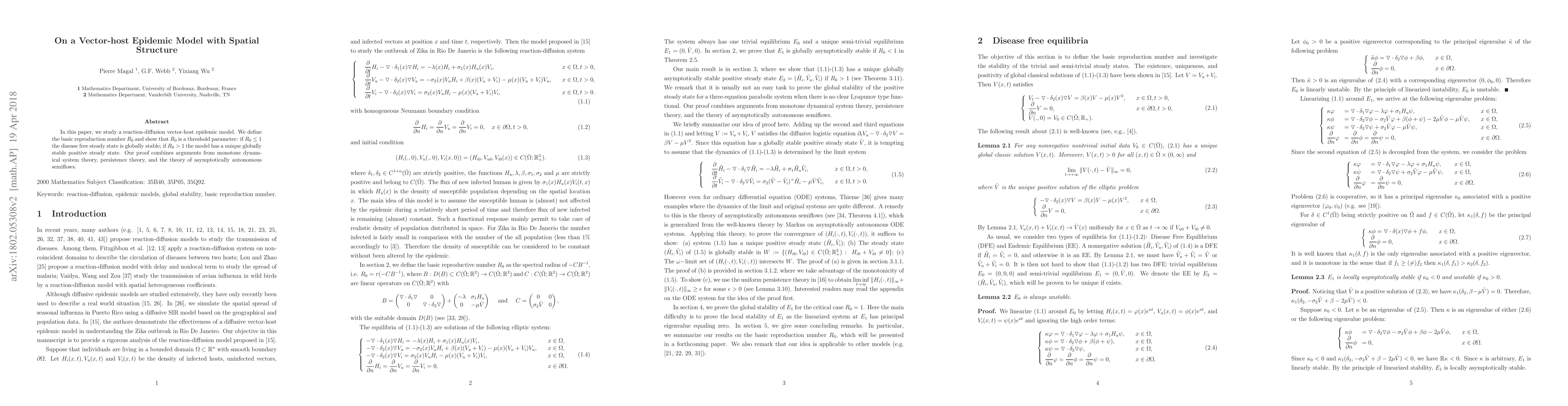 This paper investigates a reaction-diffusion vector-host epidemic model, establishing that the basic reproduction number $R_0$ determines disease dynamics: stability of the disease-free state if $R_0 \le 1$ and emergence of a unique endemic state if $R_0 > 1$. It also explores the relationship between $R_0$ and the local basic reproduction number $R(x)$ as diffusion rates change.