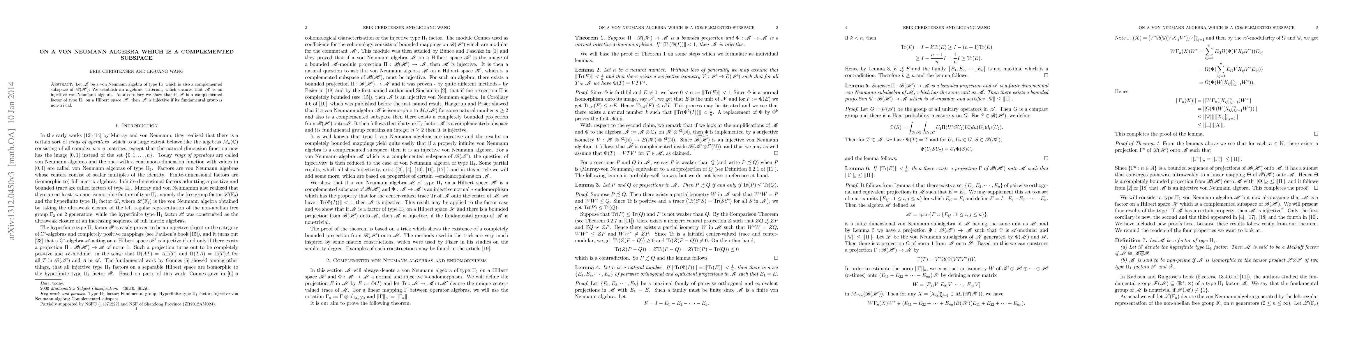 Let M be a von Neumann algebra of type II_1 which is also a complemented subspace of B(H). We establish an algebraic criterion, which ensures that M is an injective von Neumann algebra. As a corollary we show that if M is a complemented factor of type II_1 on a Hilbert space H, then M is injective if its fundamental group is non-trivial.