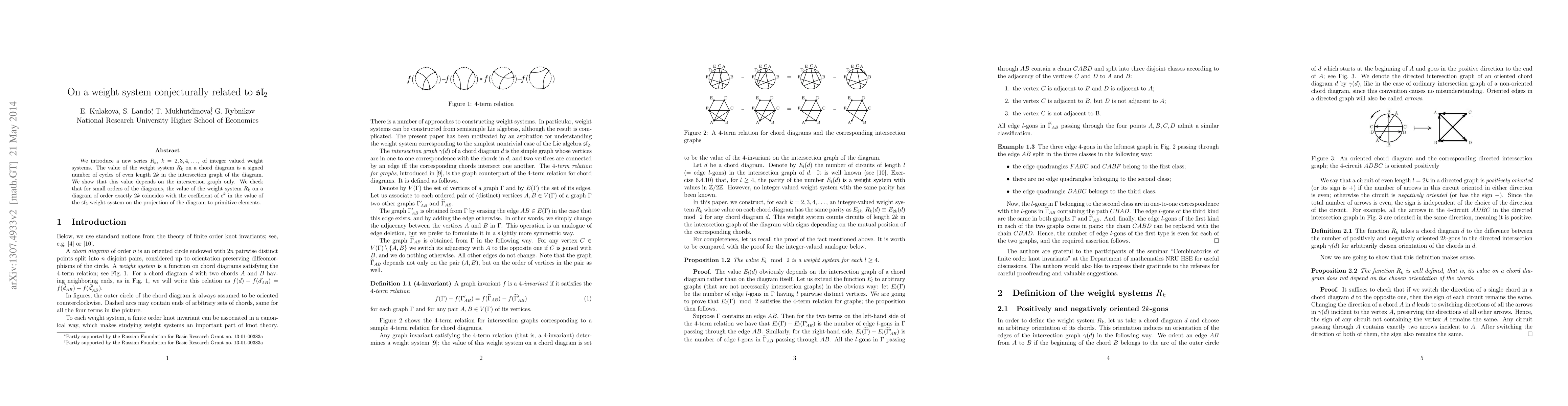We introduce a new series $R_k$, $k=2,3,4,\dots$, of integer valued weight systems. The value of the weight system $R_k$ on a chord diagram is a signed number of cycles of even length $2k$ in the intersection graph of the diagram. We show that this value depends on the intersection graph only. We check that for small orders of the diagrams, the value of the weight system $R_k$ on a diagram of order exactly $2k$ coincides with the coefficient of $c^k$ in the value of the $\mathfrak{sl}_2$-weight system on the projection of the diagram to primitive elements.