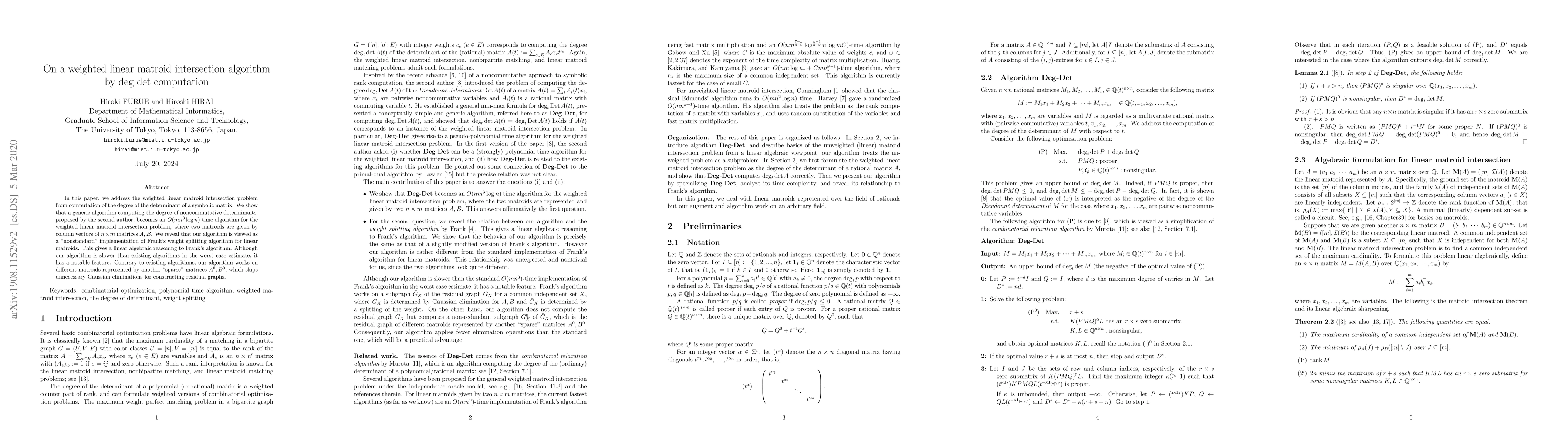 This paper presents an $O(mn^3 \log n)$ time algorithm for the weighted linear matroid intersection problem using the degree of noncommutative determinants. It reinterprets Frank's weight splitting algorithm through linear algebra, offering a novel "nonstandard" implementation that efficiently handles sparse representations of matroids.