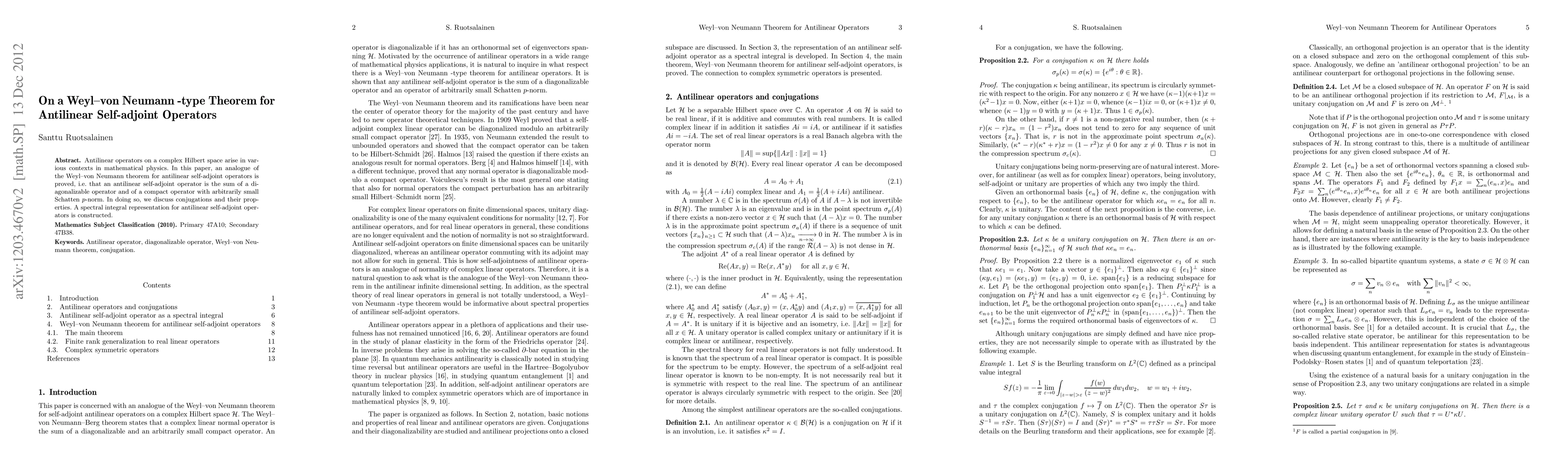 This paper proves an analogue of the Weyl-von Neumann theorem for antilinear self-adjoint operators, showing they can be decomposed into a diagonalizable part and a compact part with small Schatten $p$-norm. It also constructs a spectral integral representation for these operators and discusses the properties of conjugations.
