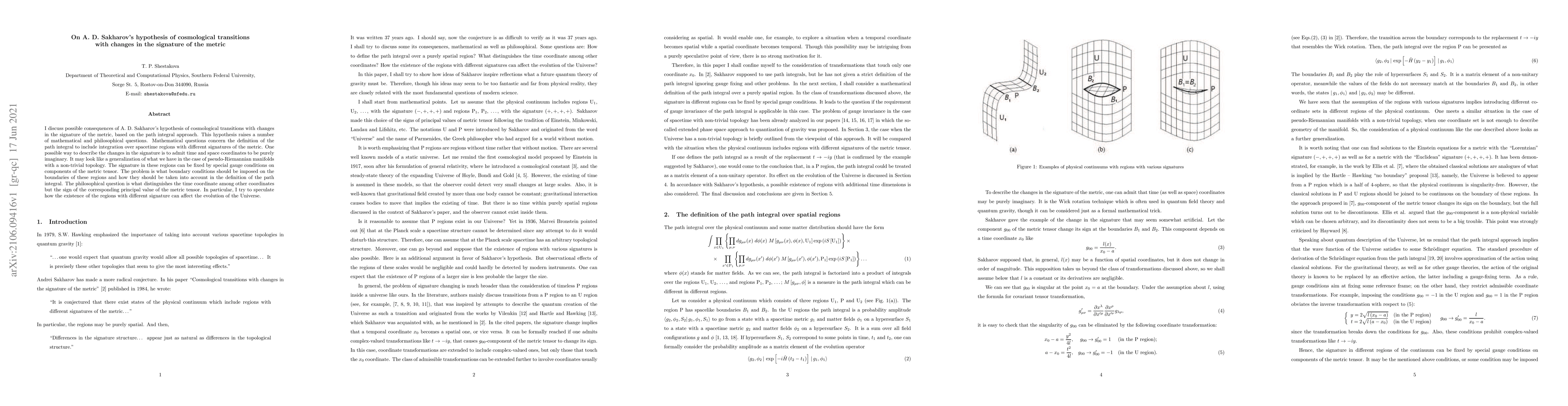 I discuss possible consequences of A. D. Sakharov's hypothesis of cosmological transitions with changes in the signature of the metric, based on the path integral approach. This hypothesis raises a number of mathematical and philosophical questions. Mathematical questions concern the definition of the path integral to include integration over spacetime regions with different signatures of the metric. One possible way to describe the changes in the signature is to admit time and space coordinates to be purely imaginary. It may look like a generalization of what we have in the case of pseudo-Riemannian manifolds with a non-trivial topology. The signature in these regions can be fixed by special gauge conditions on components of the metric tensor. The problem is what boundary conditions should be imposed on the boundaries of these regions and how they should be taken into account in the definition of the path integral. The philosophical question is what distinguishes the time coordinate among other coordinates but the sign of the corresponding principal value of the metric tensor. In particular, I try to speculate how the existence of the regions with different signature can affect the evolution of the Universe.