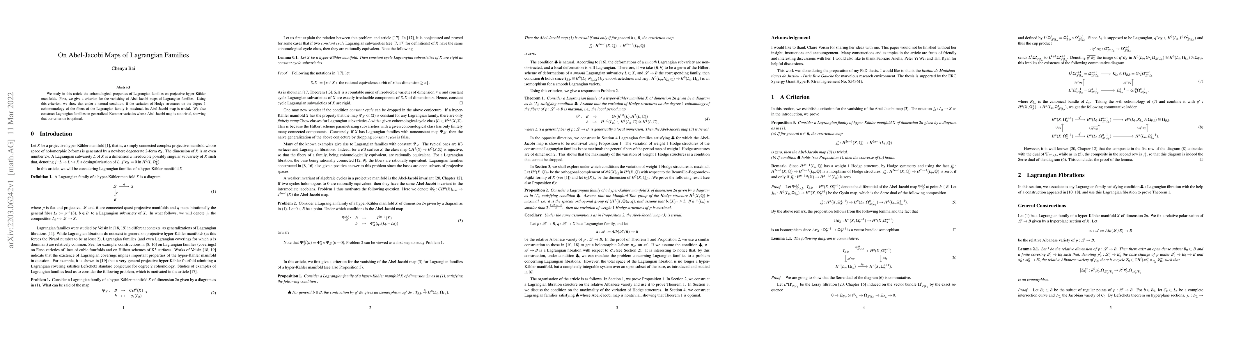 This paper investigates the cohomological properties of Lagrangian families on projective hyper-Kähler manifolds, establishing a criterion for the vanishing of Abel-Jacobi maps. It demonstrates that under certain conditions, maximal variation of Hodge structures results in a trivial Abel-Jacobi map, while also providing counterexamples showing the optimality of the criterion.