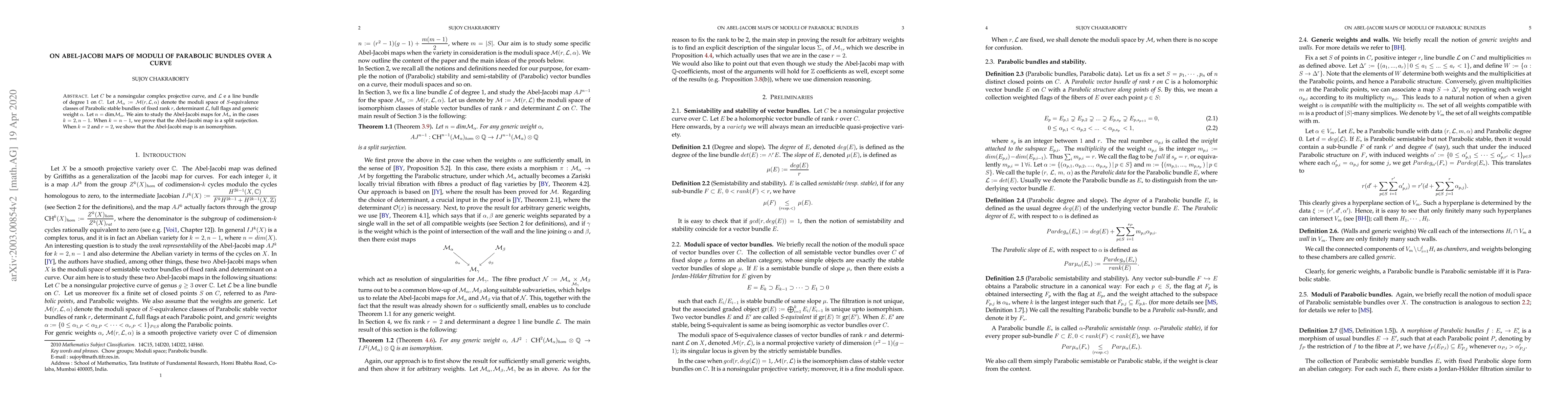 This paper investigates Abel-Jacobi maps for moduli spaces of parabolic stable bundles over a complex projective curve, proving that the map is a split surjection when $k=n-1$ and an isomorphism when $k=2$ and rank $r=2$.