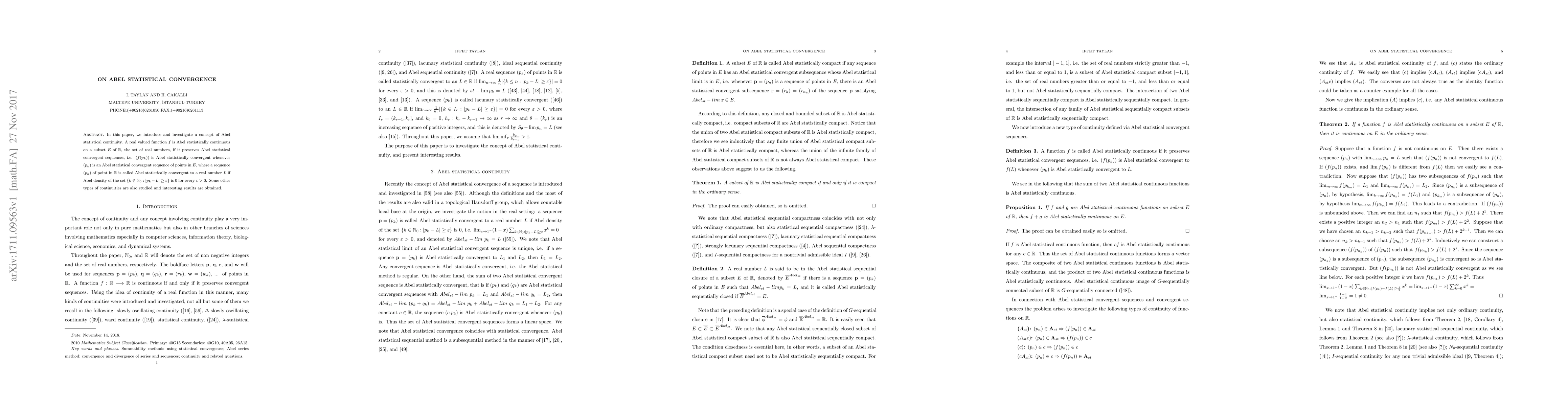 This paper introduces Abel statistical continuity for real-valued functions, where a function preserves Abel statistical convergence of sequences. It explores various types of continuities and derives interesting results regarding these concepts.