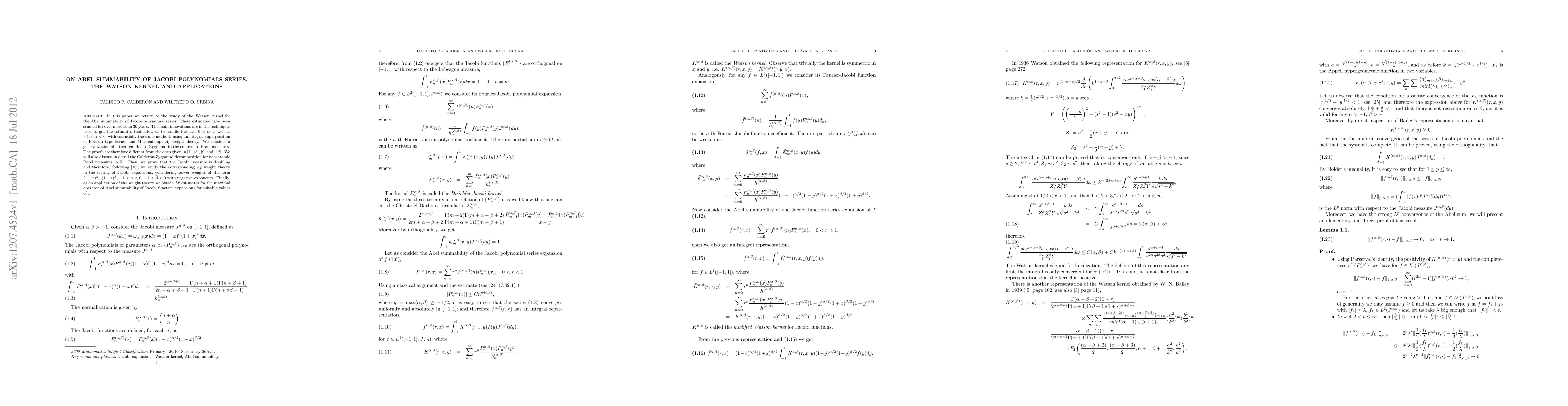 In this paper we return to the study of the Watson kernel for the Abel summabilty of Jacobi polynomial series. These estimates have been studied for over more than 30 years. The main innovations are in the techniques used to get the estimates that allow us to handle the case 0<\alpha as well as -1< \alpha <0, with essentially the same method; using an integral superposition of Poisson type kernel and Muckenhoupt A_p-weight theory. We consider a generalization of a theorem due to Zygmund in the context to Borel measures. The proofs are therefore different from the ones given in previous papers by several authors. We will also discuss in detail the Calder\'on-Zygmund decomposition for non-atomic Borel measures in the real line. Then, we prove that the Jacobi measure is doubling and therefore, following a work of A. P. Calder\'on, we study the corresponding A_p weight theory in the setting of Jacobi expansions, considering power weights of the form (1-x)^{\bar{\alpha}}, (1+x)^{\bar{\beta}}, -1 < {\bar{\alpha}}<0,\, -1 < {\bar{\beta}}<0 with negative exponents. Finally, as an application of the weight theory we obtain L^p estimates for the maximal operator of Abel summability of Jacobi function expansions for suitable values of p.