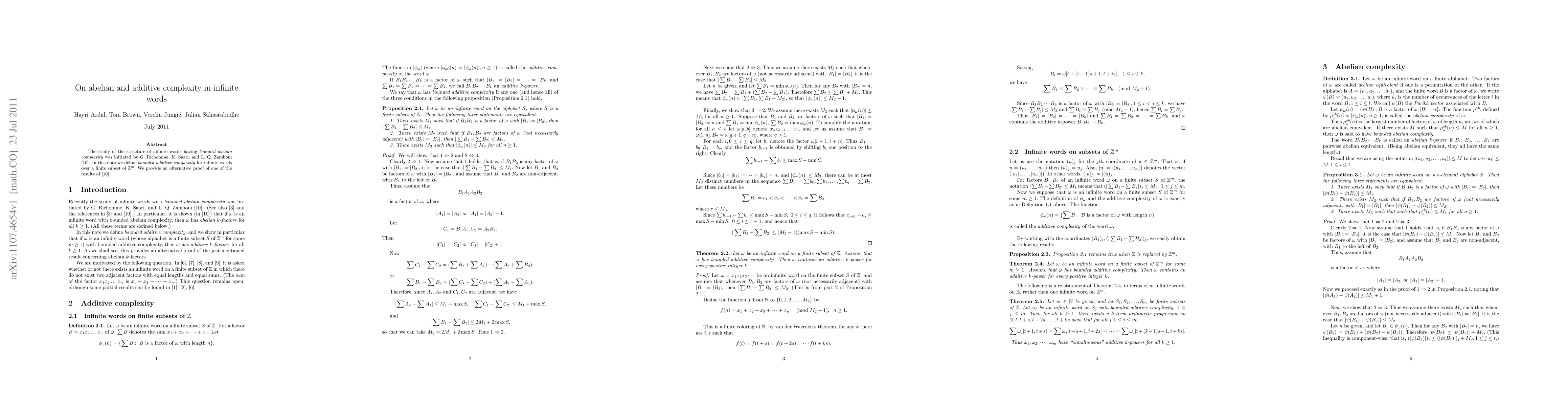 The paper introduces bounded additive complexity for infinite words over a finite subset of Z^m, providing an alternative proof for a result by Richomme, Saari, and Zamboni on bounded abelian complexity.