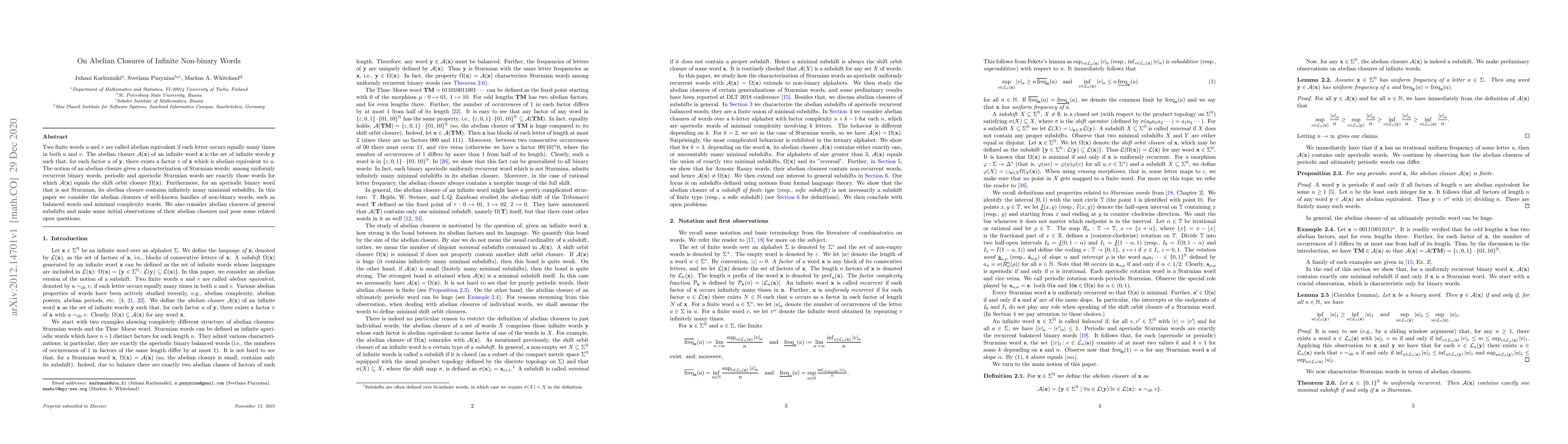 Two finite words $u$ and $v$ are called abelian equivalent if each letter occurs equally many times in both $u$ and $v$. The abelian closure $\mathcal{A}(\mathbf{x})$ of an infinite word $\mathbf{x}$ is the set of infinite words $\mathbf{y}$ such that, for each factor $u$ of $\mathbf{y}$, there exists a factor $v$ of $\mathbf{x}$ which is abelian equivalent to $u$. The notion of an abelian closure gives a characterization of Sturmian words: among uniformly recurrent binary words, periodic and aperiodic Sturmian words are exactly those words for which $\mathcal{A}(\mathbf{x})$ equals the shift orbit closure $\Omega(\mathbf{x})$. Furthermore, for an aperiodic binary word that is not Sturmian, its abelian closure contains infinitely many minimial subshifts. In this paper we consider the abelian closures of well-known families of non-binary words, such as balanced words and minimal complexity words. We also consider abelian closures of general subshifts and make some initial observations of their abelian closures and pose some related open questions.