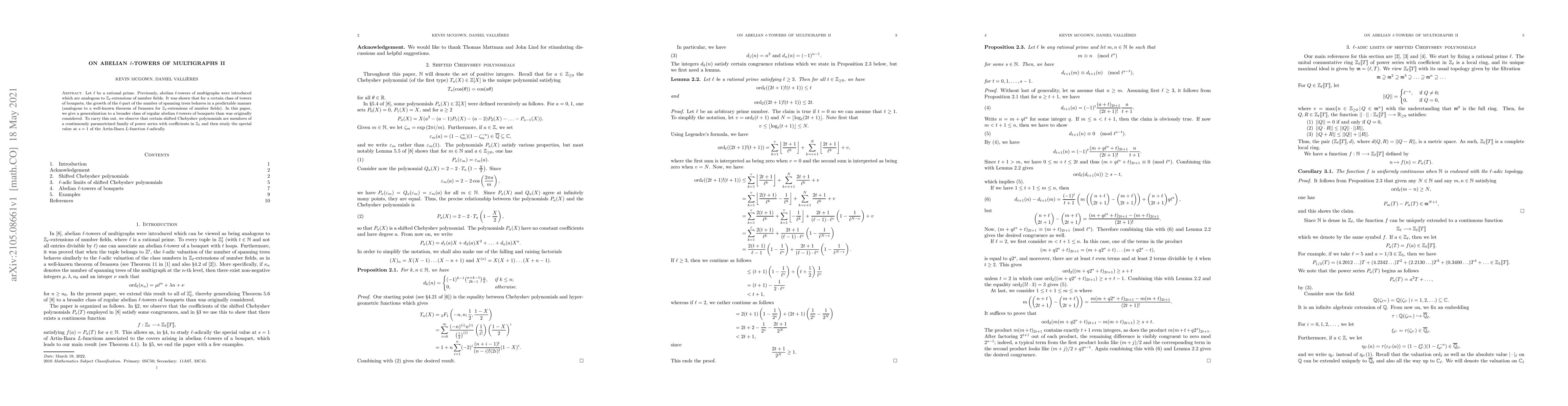 Let $\ell$ be a rational prime. Previously, abelian $\ell$-towers of multigraphs were introduced which are analogous to $\mathbb{Z}_{\ell}$-extensions of number fields. It was shown that for a certain class of towers of bouquets, the growth of the $\ell$-part of the number of spanning trees behaves in a predictable manner (analogous to a well-known theorem of Iwasawa for $\mathbb{Z}_{\ell}$-extensions of number fields). In this paper, we give a generalization to a broader class of regular abelian $\ell$-towers of bouquets than was originally considered. To carry this out, we observe that certain shifted Chebyshev polynomials are members of a continuously parametrized family of power series with coefficients in $\mathbb{Z}_{\ell}$ and then study the special value at $s=1$ of the Artin-Ihara $L$-function $\ell$-adically.