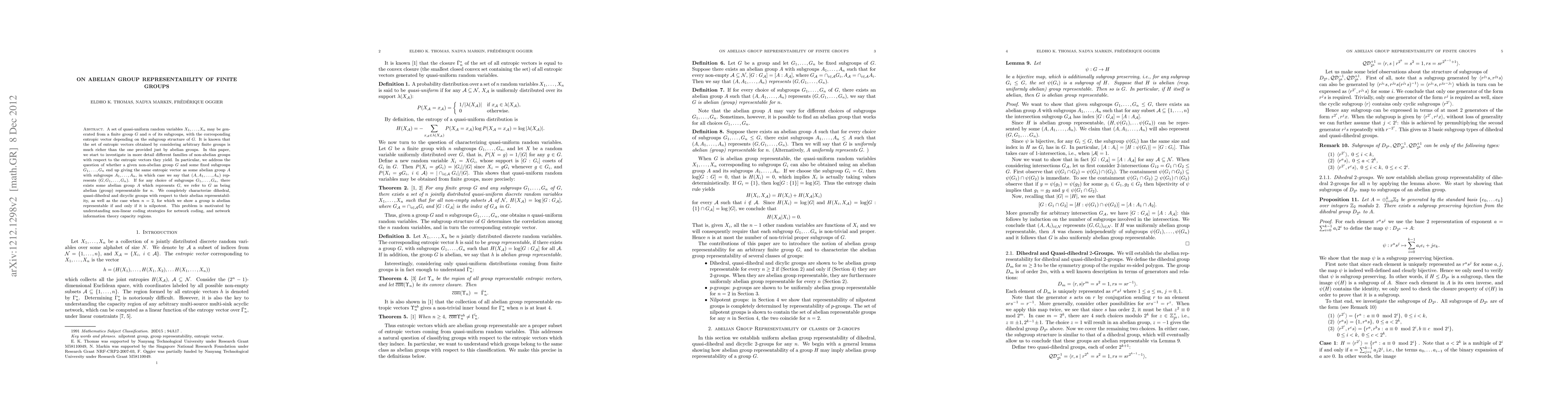 A set of quasi-uniform random variables $X_1,...,X_n$ may be generated from a finite group $G$ and $n$ of its subgroups, with the corresponding entropic vector depending on the subgroup structure of $G$. It is known that the set of entropic vectors obtained by considering arbitrary finite groups is much richer than the one provided just by abelian groups. In this paper, we start to investigate in more detail different families of non-abelian groups with respect to the entropic vectors they yield. In particular, we address the question of whether a given non-abelian group $G$ and some fixed subgroups $G_1,...,G_n$ end up giving the same entropic vector as some abelian group $A$ with subgroups $A_1,...,A_n$, in which case we say that $(A, A_1,..., A_n)$ represents $(G, G_1, ..., G_n)$. If for any choice of subgroups $G_1,...,G_n$, there exists some abelian group $A$ which represents $G$, we refer to $G$ as being abelian (group) representable for $n$. We completely characterize dihedral, quasi-dihedral and dicyclic groups with respect to their abelian representability, as well as the case when $n=2$, for which we show a group is abelian representable if and only if it is nilpotent. This problem is motivated by understanding non-linear coding strategies for network coding, and network information theory capacity regions.