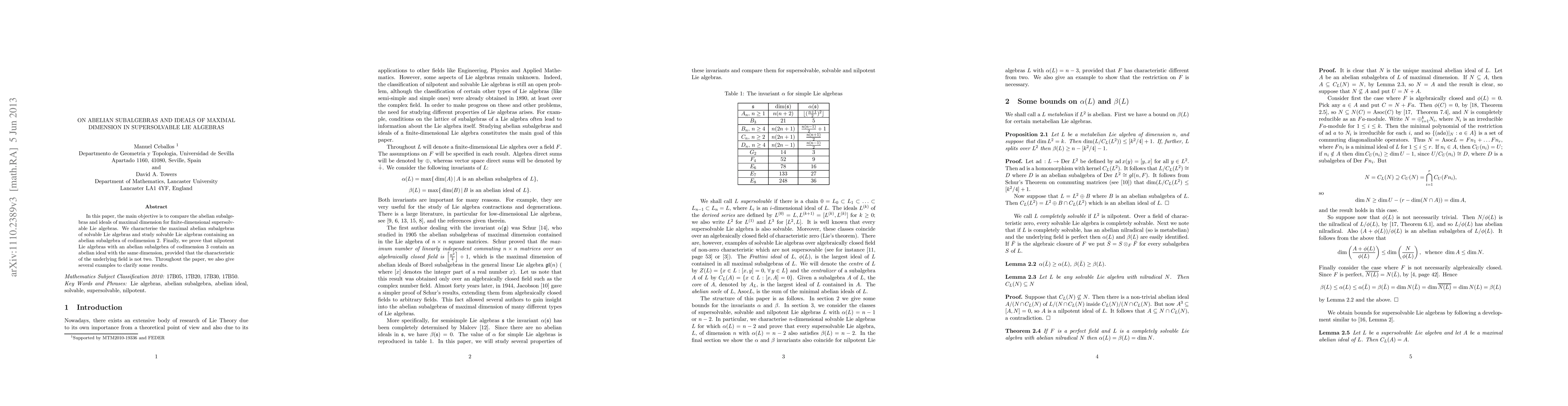 This paper characterizes maximal abelian subalgebras and ideals in finite-dimensional supersolvable Lie algebras, focusing on those of codimension 2 and 3, and proves that nilpotent Lie algebras with a codimension 3 abelian subalgebra contain a corresponding abelian ideal, excluding fields of characteristic two.