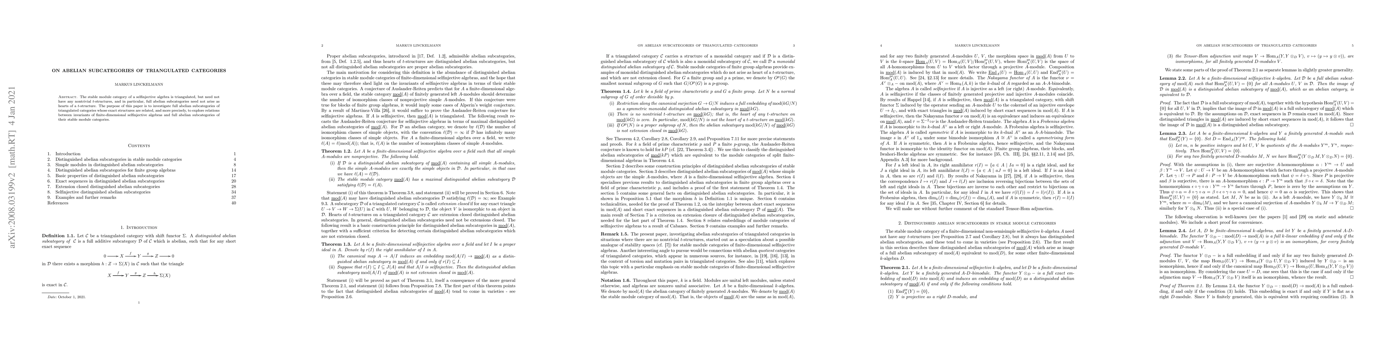 The stable module category of a selfinjective algebra is triangulated, but need not have any nontrivial $t$-structures, and in particular, full abelian subcategories need not arise as hearts of a $t$-structure. The purpose of this paper is to investigate full abelian subcategories of triangulated categories whose exact structures are related, and more precisely, to explore relations between invariants of finite-dimensional selfinjective algebras and full abelian subcategories of their stable module categories.