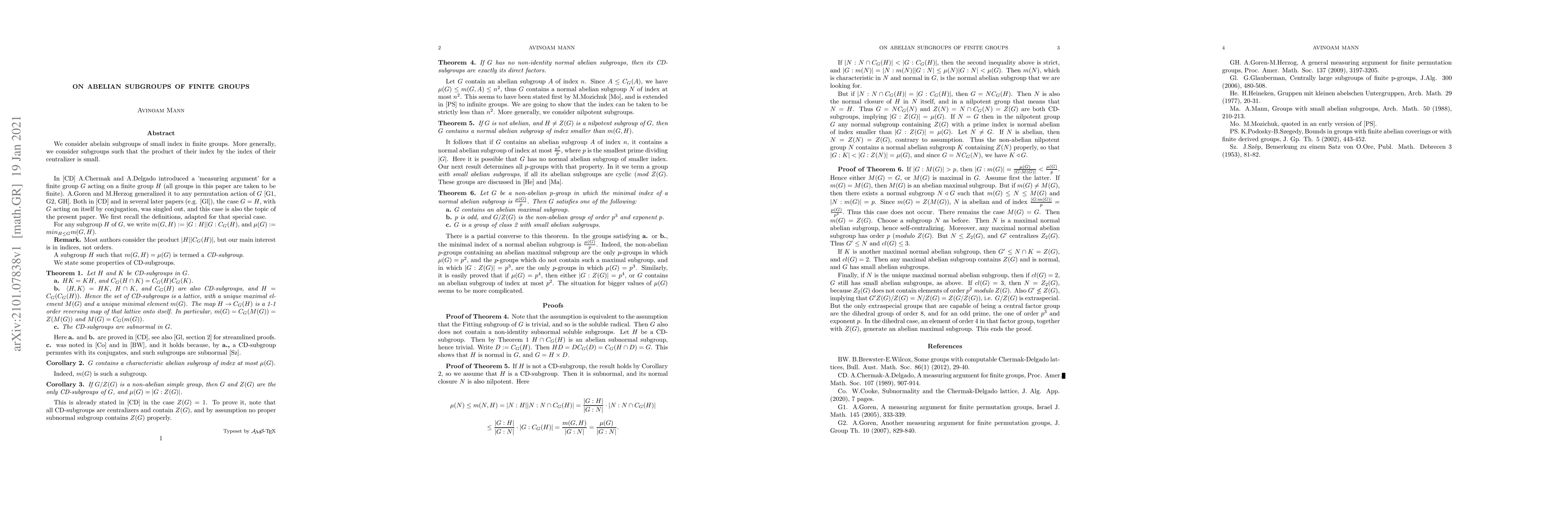 Summary: This paper investigates the properties of abelian subgroups within finite groups, focusing on those with small indices or where the product of their index and the index of their centralizer is minimal. The study aims to understand the structural implications of such subgroups.