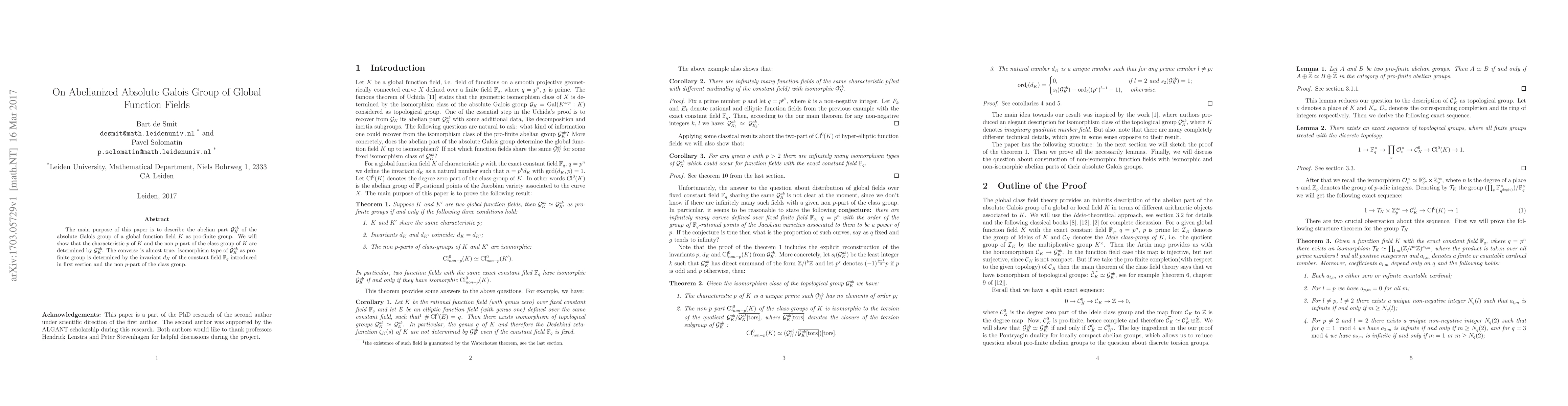 This paper investigates the abelianized absolute Galois group $\mathcal G^{ab}_{K}$ of a global function field $K$, demonstrating that it determines the characteristic $p$ of $K$ and the non $p$-part of its class group. The isomorphism type of $\mathcal G_K^{ab}$ is largely determined by the invariant $d_K$ and the non $p$-part of the class group.