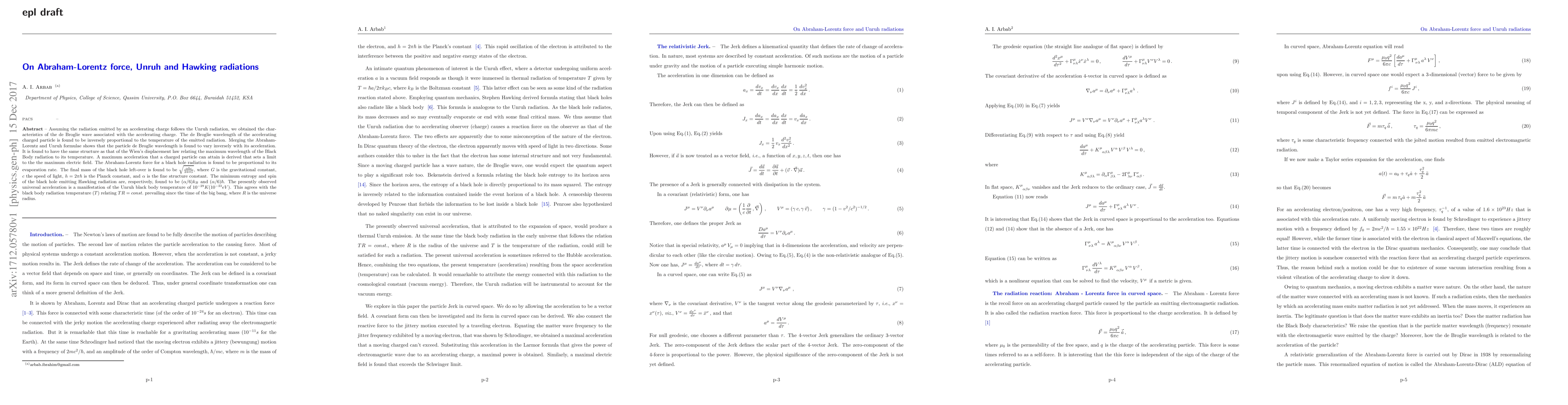 Assuming the radiation emitted by an accelerating charge follows the Unruh radiation, we obtained the characteristics of the de Broglie wave associated with the accelerating charge. The de Broglie wavelength of the accelerating charged particle is found to be inversely proportional to the temperature of the emitted radiation. Merging the Abraham-Lorentz and Unruh formulae shows that the particle de Broglie wavelength is found to vary inversely with its acceleration. It is found to have the same structure as that of the Wien's displacement law relating the maximum wavelength of the Black Body radiation to its temperature. A maximum acceleration that a charged particle can attain is derived that sets a limit to the the maximum electric field. The Abraham-Lorentz force for a black hole radiation is found to be proportional to its evaporation rate. The final mass of the black hole left-over is found to be $\sqrt{\frac{\alpha\hbar c}{24 \pi G} }$, where $G$ is the gravitational constant, $c$ the speed of light, $h=2\pi\hbar$ is the Planck constant, and $\alpha$ is the fine structure constant. The minimum entropy and spin of the black hole emitting Hawking radiation are, respectively, found to be $(\alpha/6) k_B$ and $(\alpha/6)\hbar$. The presently observed universal acceleration is a manifestation of the Unruh black body temperature of $10^{-29}K$. This agrees with the black body radiation temperature ($T$) relating $TR=const.$ prevailing since the time of the big bang, where $R$ is the universe radius.