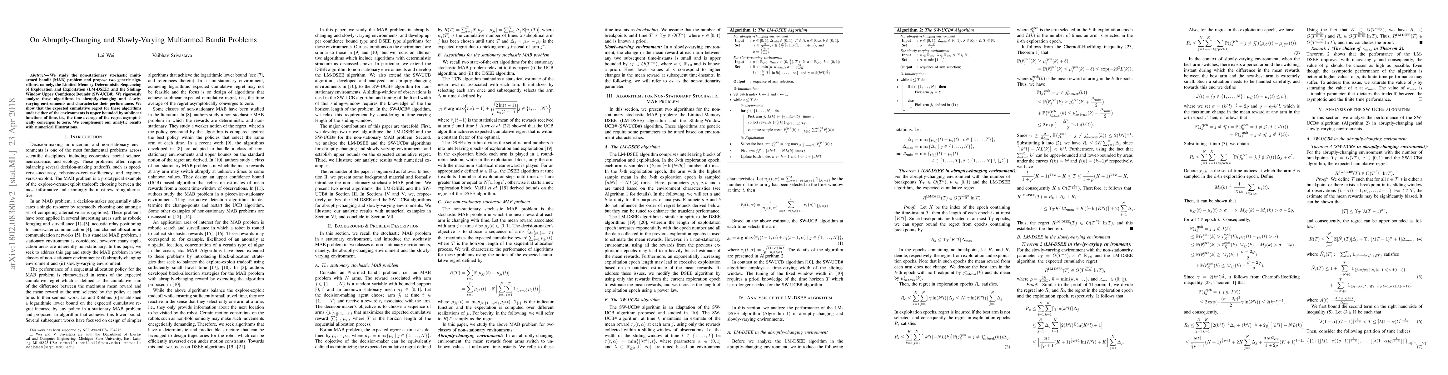 This paper proposes two algorithms for non-stationary stochastic multiarmed bandit problems: LM-DSEE and SW-UCB#. The authors analyze their performance in abruptly-changing and slowly-varying environments, showing that the expected cumulative regret is upper bounded by sublinear functions of time, indicating asymptotic convergence of regret to zero.