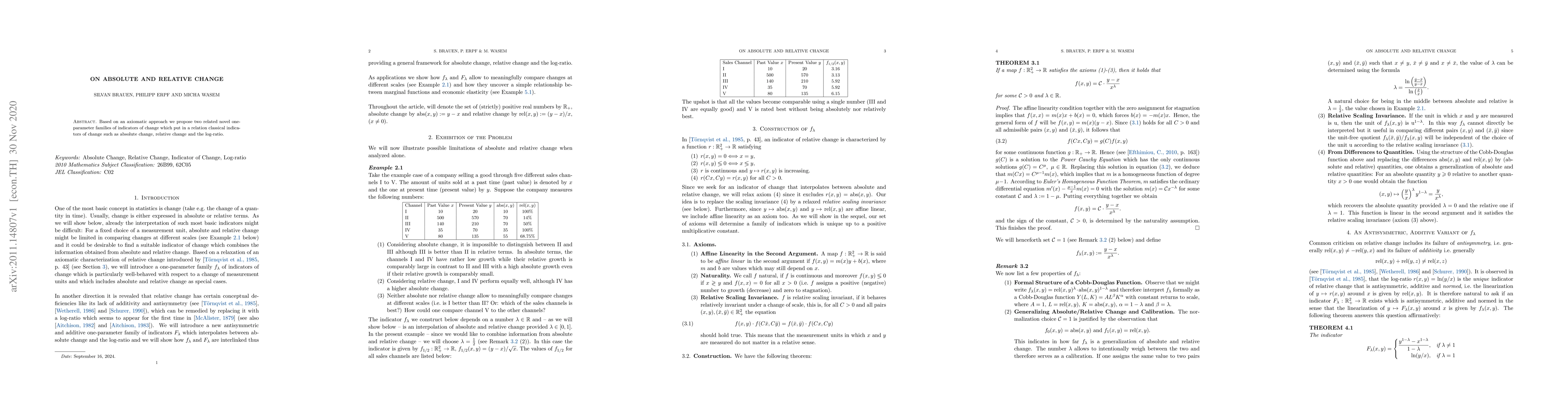 Based on an axiomatic approach we propose two related novel one-parameter families of indicators of change which put in a relation classical indicators of change such as absolute change, relative change and the log-ratio.
