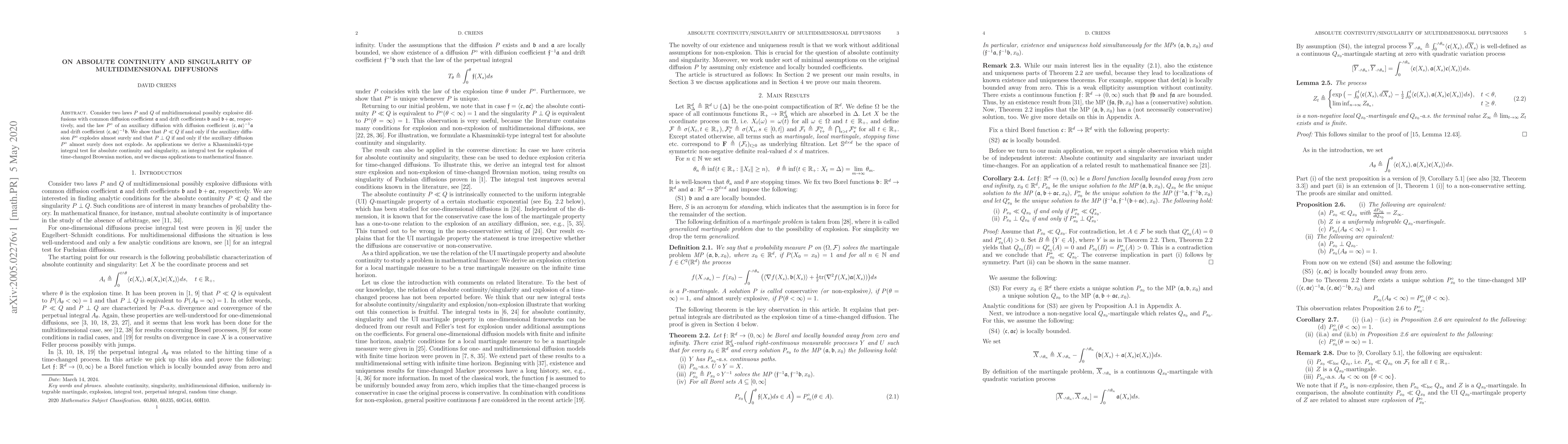 This paper investigates the absolute continuity and singularity of laws \(P\) and \(Q\) of multidimensional diffusions, showing that \(P \ll Q\) if the auxiliary diffusion \(P^\circ\) explodes almost surely, and \(P \perp Q\) if \(P^\circ\) does not explode. It also derives a Khasminskii-type integral test and discusses applications in mathematical finance.