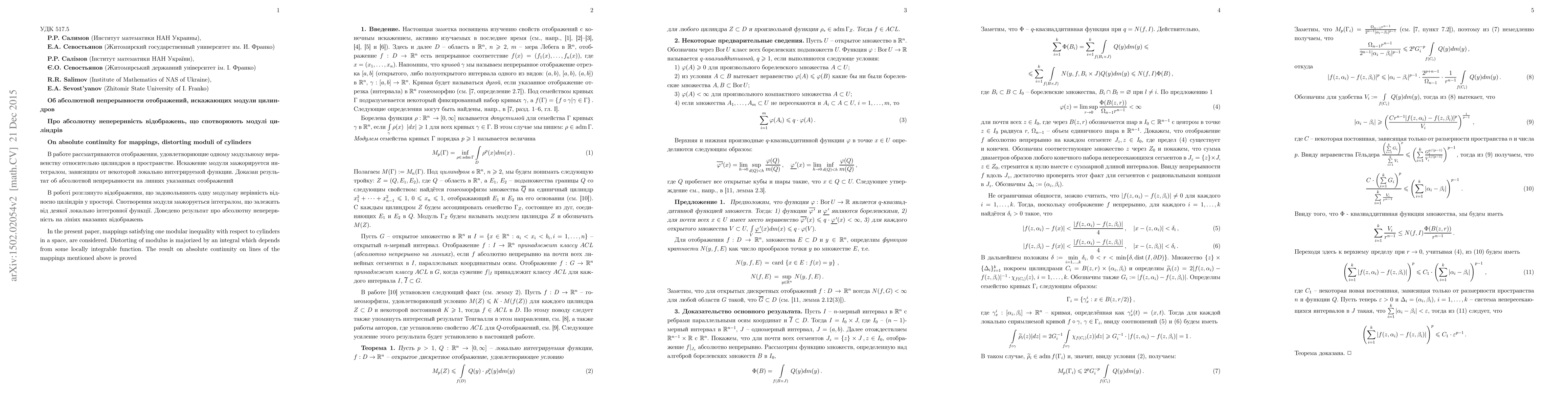 This paper investigates mappings that satisfy a modular inequality concerning cylinders in a space, showing that the distortion of modulus is bounded by an integral dependent on a locally integrable function. The study concludes with a proof of the absolute continuity of these mappings along lines.