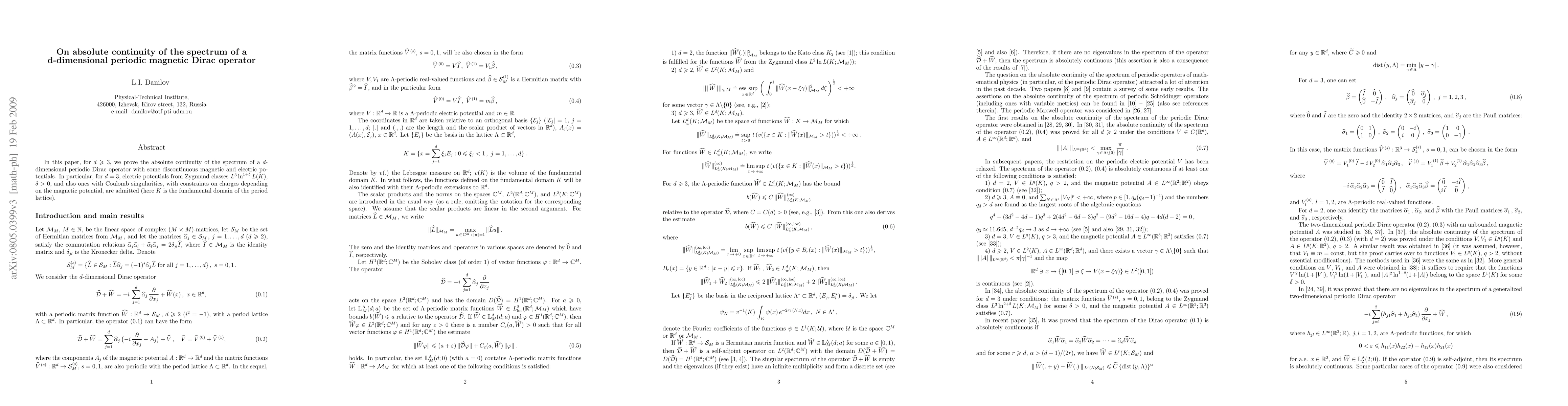 In this paper, for d > 2, we prove the absolute continuity of the spectrum of a d-dimensional periodic Dirac operator with some discontinuous magnetic and electric potentials. In particular, for d = 3, electric potentials from Zygmund classes $L^3\ln ^{1+\delta}L(K)$, $\delta >0$, and also ones with Coulomb singularities, with constraints on charges depending on the magnetic potential, are admitted (here K is the fundamental domain of the period lattice).