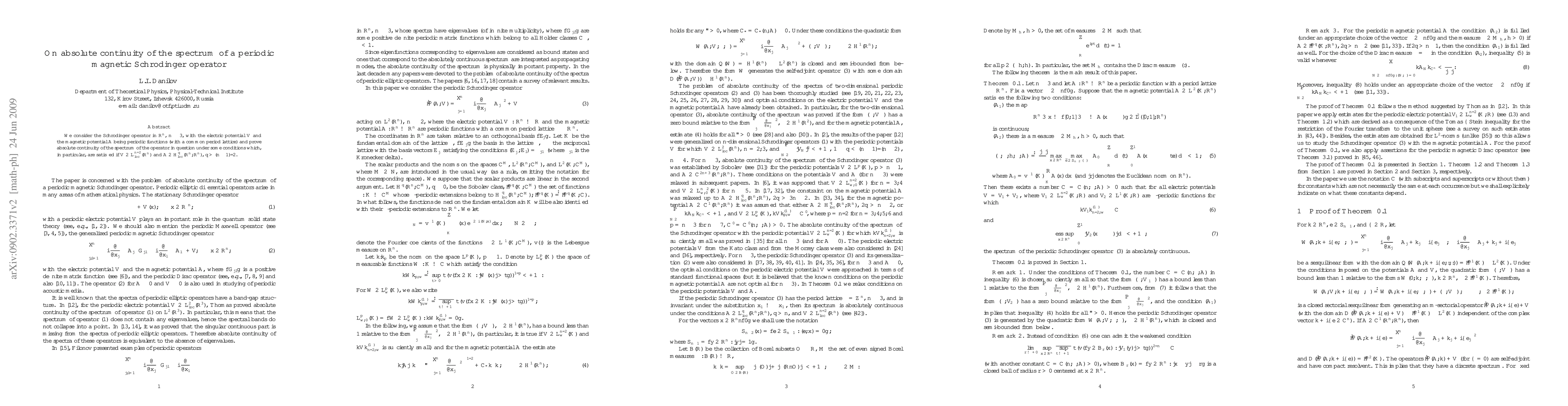 Summary: This paper proves the absolute continuity of the spectrum for a periodic magnetic Schrödinger operator in ${\mathbb R}^n$ ($n\geq 3$) under conditions that include the local integrability of the electric potential and the local Sobolev regularity of the magnetic potential.
