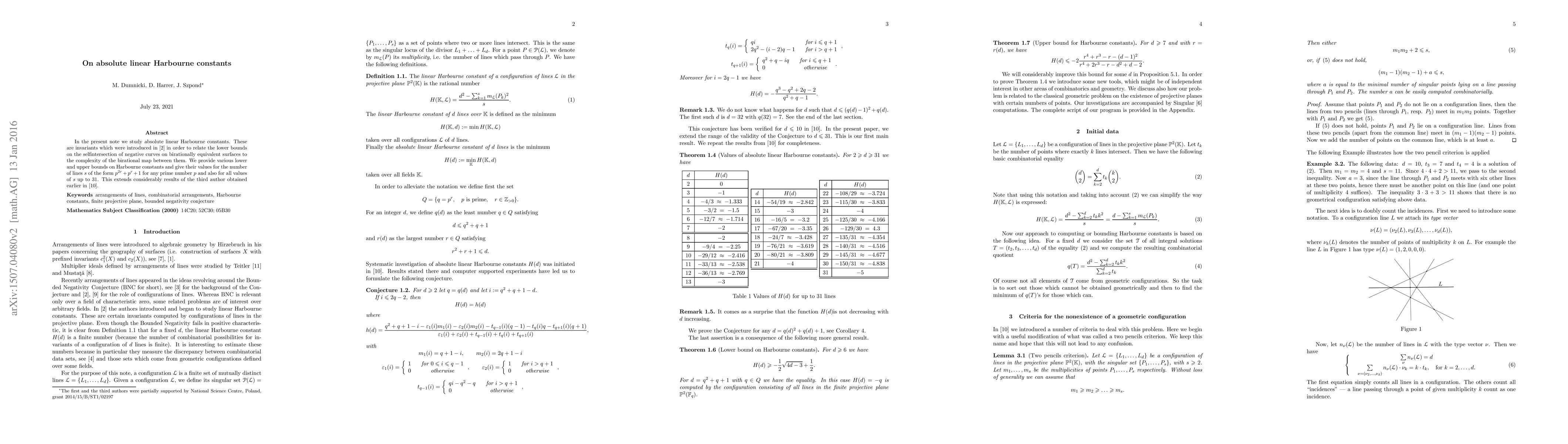 In the present note we study absolute linear Harbourne constants. These are invariants which were introduced in order to relate the lower bounds on the selfintersection of negative curves on birationally equivalent surfaces to the complexity of the birational map between them. We provide various lower and upper bounds on Harbourne constants and give their values for the number of lines $s$ of the form $p^{2r}+p^r+1$ for any prime number $p$ and also for all values of $s$ up to $31$. This extends considerably earlier results of the third author.