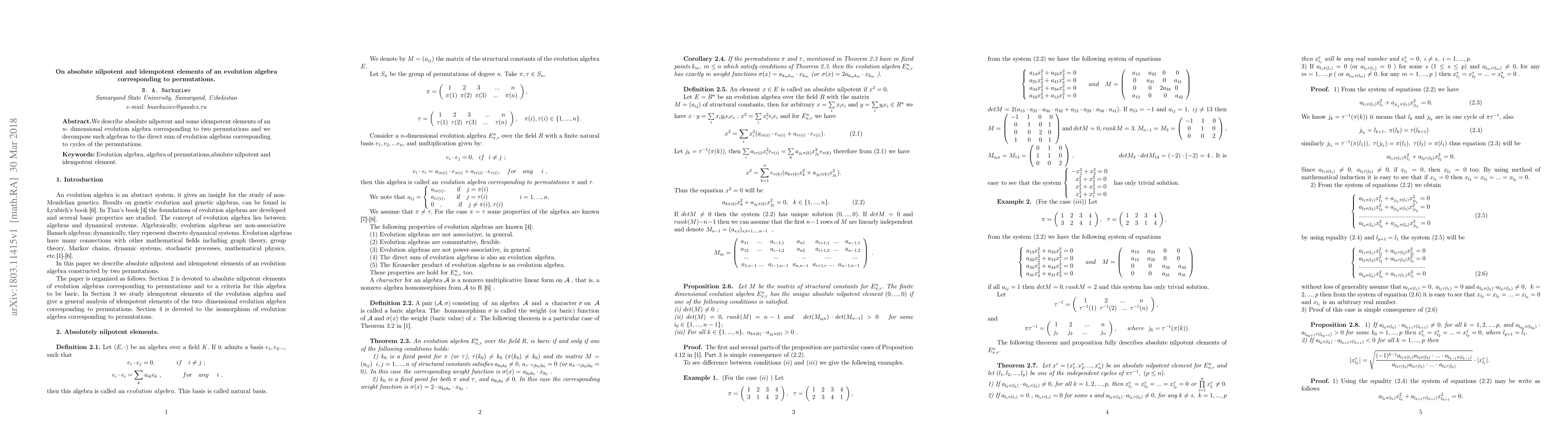 We describe absolute nilpotent and some idempotent elements of an $n$- dimensional evolution algebra corresponding to two permutations and we decompose such algebras to the direct sum of evolution algebras corresponding to cycles of the permutations.