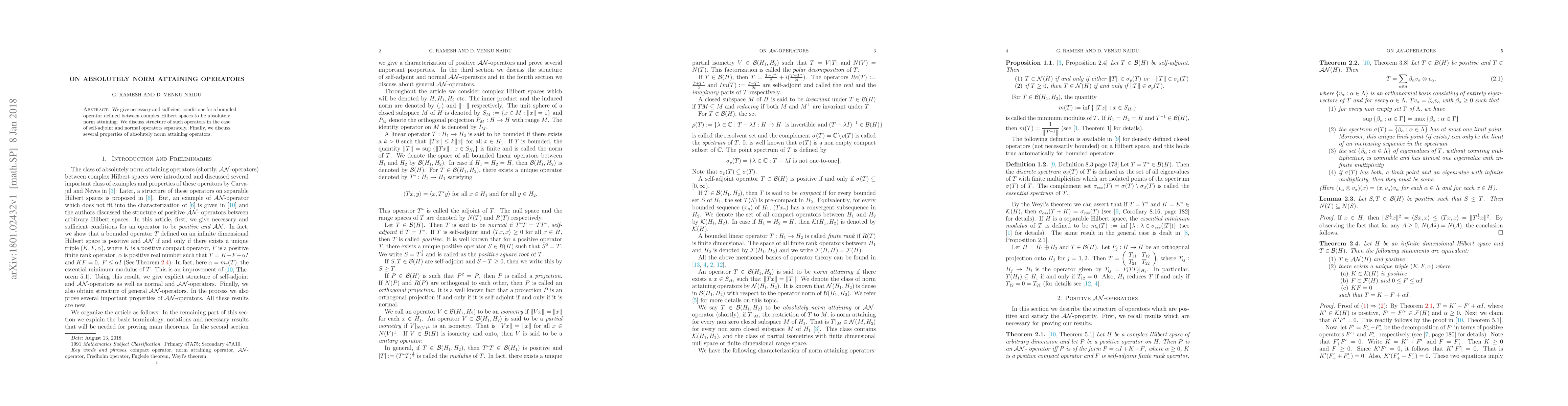 The paper presents a comprehensive analysis of absolutely norm attaining operators, providing detailed conditions and structures for self-adjoint and normal operators, along with several properties and corollaries.