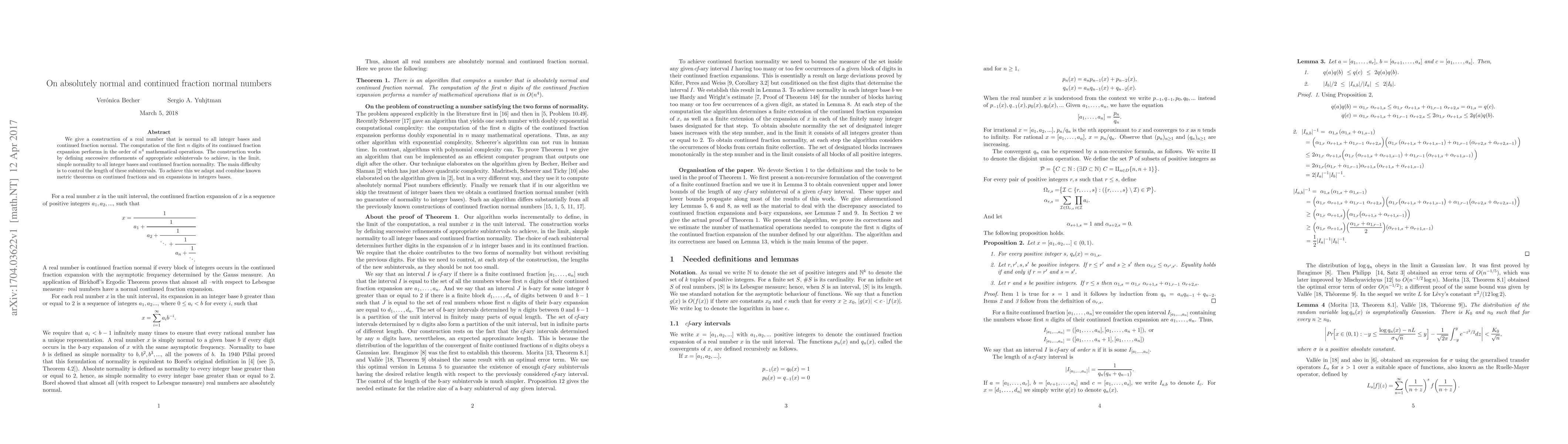 This research contributes to the understanding of absolutely normal and continued fraction normal numbers, providing a construction method and analyzing its computational complexity, which has implications for number theory and computational mathematics.