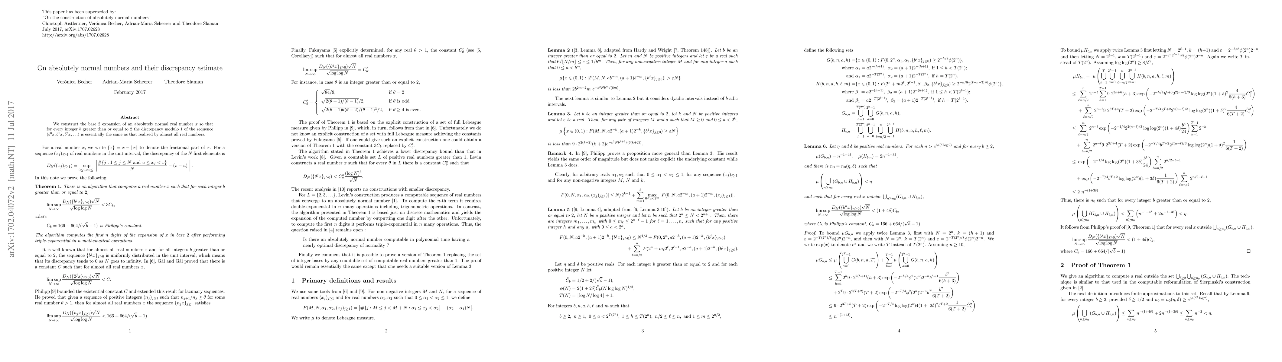 We construct the base $2$ expansion of an absolutely normal real number $x$ so that, for every integer $b$ greater than or equal to $2$, the discrepancy modulo $1$ of the sequence $(b^0 x, b^1 x, b^2 x , \ldots)$ is essentially the same as that realized by almost all real numbers.