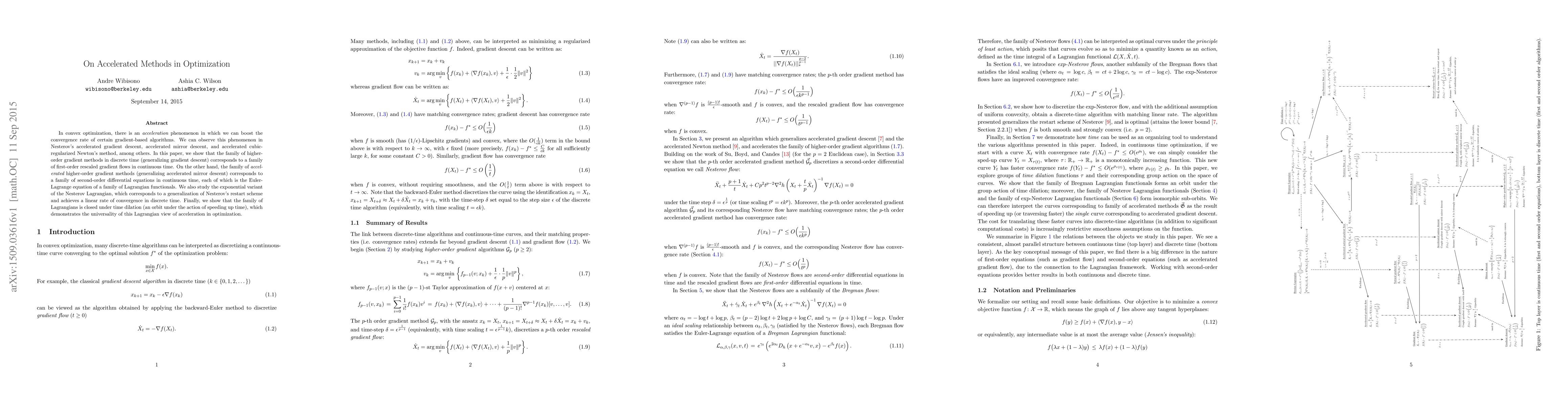 This paper explores accelerated gradient methods in convex optimization, demonstrating that higher-order gradient methods correspond to first-order rescaled gradient flows in continuous time, while accelerated methods relate to second-order differential equations. It also introduces an exponential variant of Nesterov's Lagrangian achieving linear convergence.