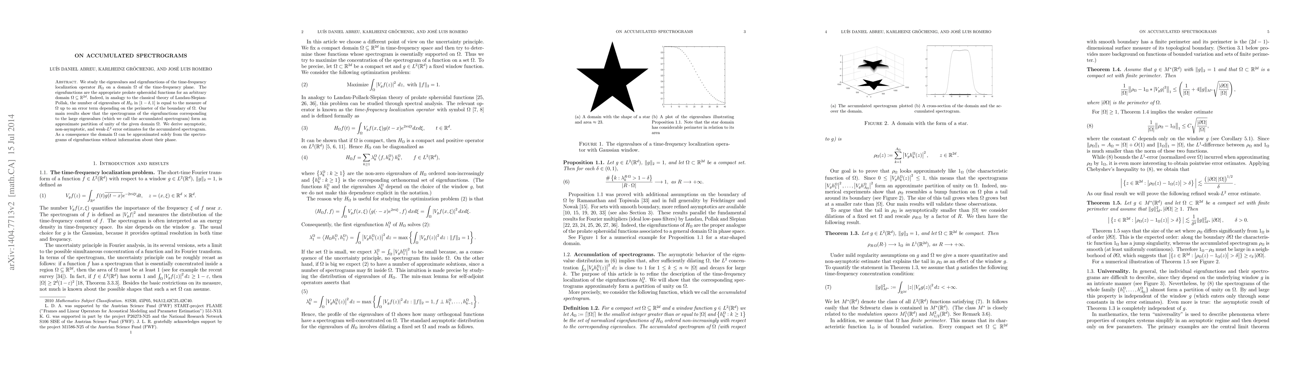 We study the eigenvalues and eigenfunctions of the time-frequency localization operator $H_\Omega$ on a domain $\Omega$ of the time-frequency plane. The eigenfunctions are the appropriate prolate spheroidal functions for an arbitrary domain $\Omega$. Indeed, in analogy to the classical theory of Landau-Slepian-Pollak, the number of eigenvalues of $H_\Omega$ in $[1-\delta , 1]$ is equal to the measure of $\Omega$ up to an error term depending on the perimeter of the boundary of $\Omega$. Our main results show that the spectrograms of the eigenfunctions corresponding to the large eigenvalues (which we call the accumulated spectrogram) form an approximate partition ofunity of the given domain $\Omega $. We derive both asymptotic, non-asymptotic, and weak $L^2$ error estimates for the accumulated spectrogram. As a consequence the domain $\Omega$ can be approximated solely from the spectrograms of eigenfunctions without information about their phase.