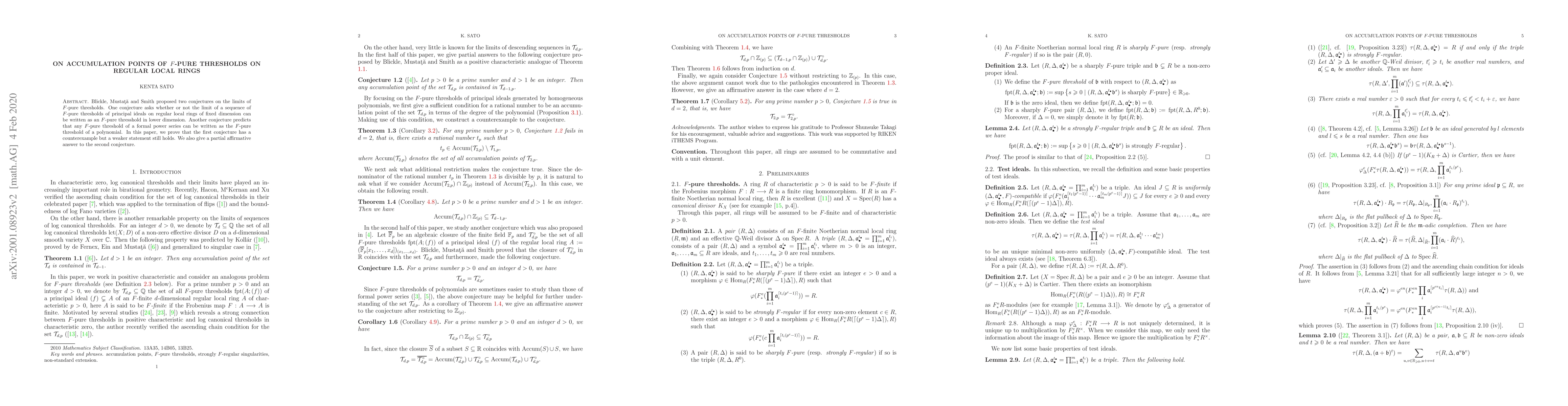 Blickle, Musta\c{t}\u{a} and Smith proposed two conjectures on the limits of $F$-pure thresholds. One conjecture asks whether or not the limit of a sequence of $F$-pure thresholds of principal ideals on regular local rings of fixed dimension can be written as an $F$-pure threshold in lower dimension. Another conjecture predicts that any $F$-pure threshold of a formal power series can be written as the $F$-pure threshold of a polynomial. In this paper, we prove that the first conjecture has a counterexample but a weaker statement still holds. We also give a partial affirmative answer to the second conjecture.