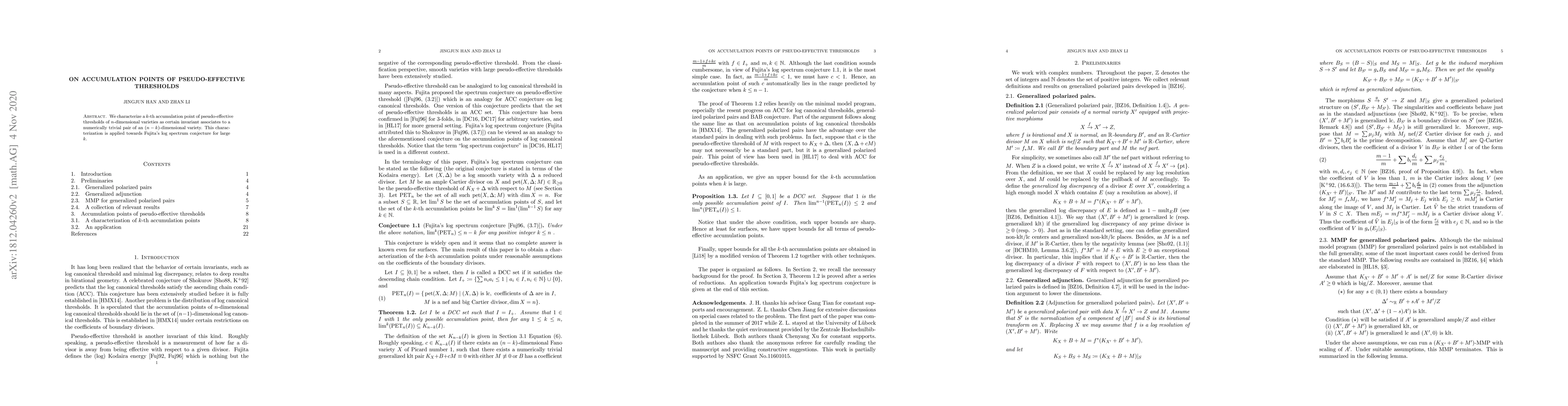 This paper characterizes $k$-th accumulation points of pseudo-effective thresholds in $n$-dimensional varieties as invariants linked to numerically trivial pairs of $(n-k)$-dimensional varieties, and applies this characterization to advance Fujita's log spectrum conjecture for large $k$.