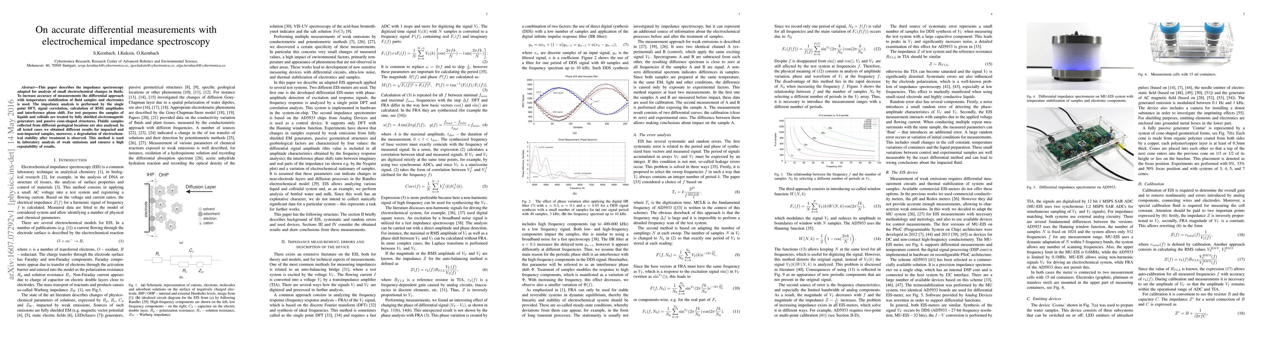 This paper describes the impedance spectroscopy adapted for analysis of small electrochemical changes in fluids. To increase accuracy of measurements the differential approach with temperature stabilization of fluid samples and electronics is used. The impedance analysis is performed by the single point DFT, signal correlation, calculation of RMS amplitudes and interference phase shift. For test purposes the samples of liquids and colloids are treated by fully shielded electromagnetic generators and passive cone-shaped structures. Fluidic samples collected from different geological locations are also analysed. In all tested cases we obtained different results for impacted and non-impacted samples, moreover, a degradation of electrochemical stability after treatment is observed. This method is used in laboratory analysis of weak emissions and ensures a high repeatability of results.