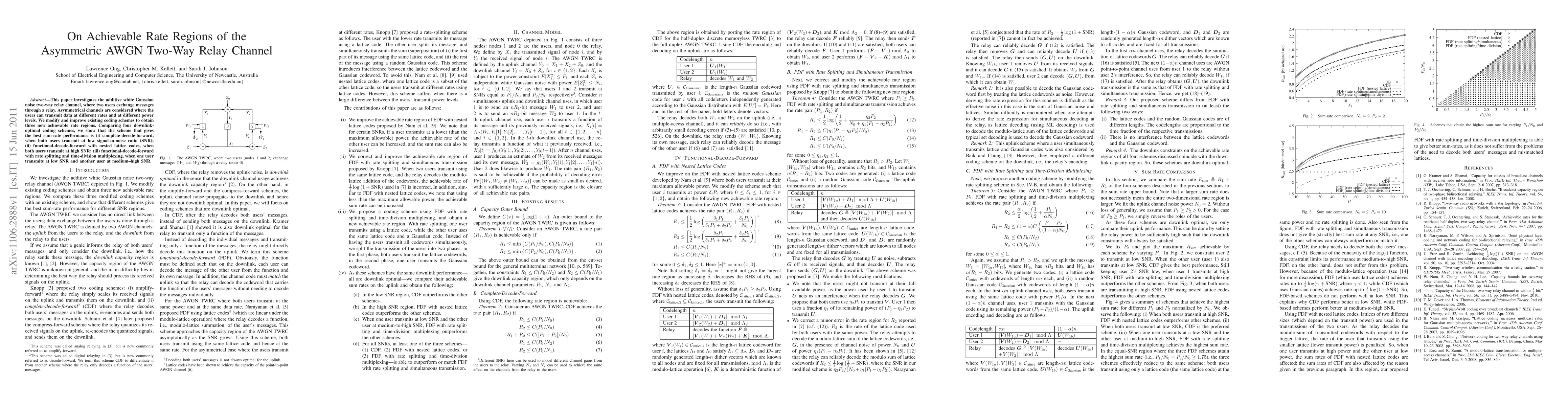 This paper explores achievable rate regions for the asymmetric AWGN two-way relay channel, proposing three new coding schemes. It finds that the best sum-rate performance is achieved by complete-decode-forward at low SNR, functional-decode-forward with nested lattice codes at high SNR, and functional-decode-forward with rate splitting at mixed SNR levels.